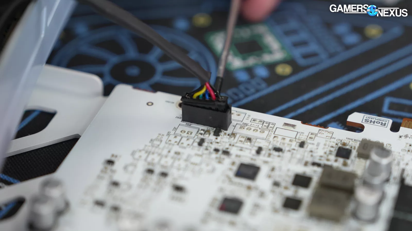 Looking at the PCB, the company has really good attention to detail on the white board, which matches the white back plate, and compliments the light-colored shroud on the front well. The color matching is cool to see.