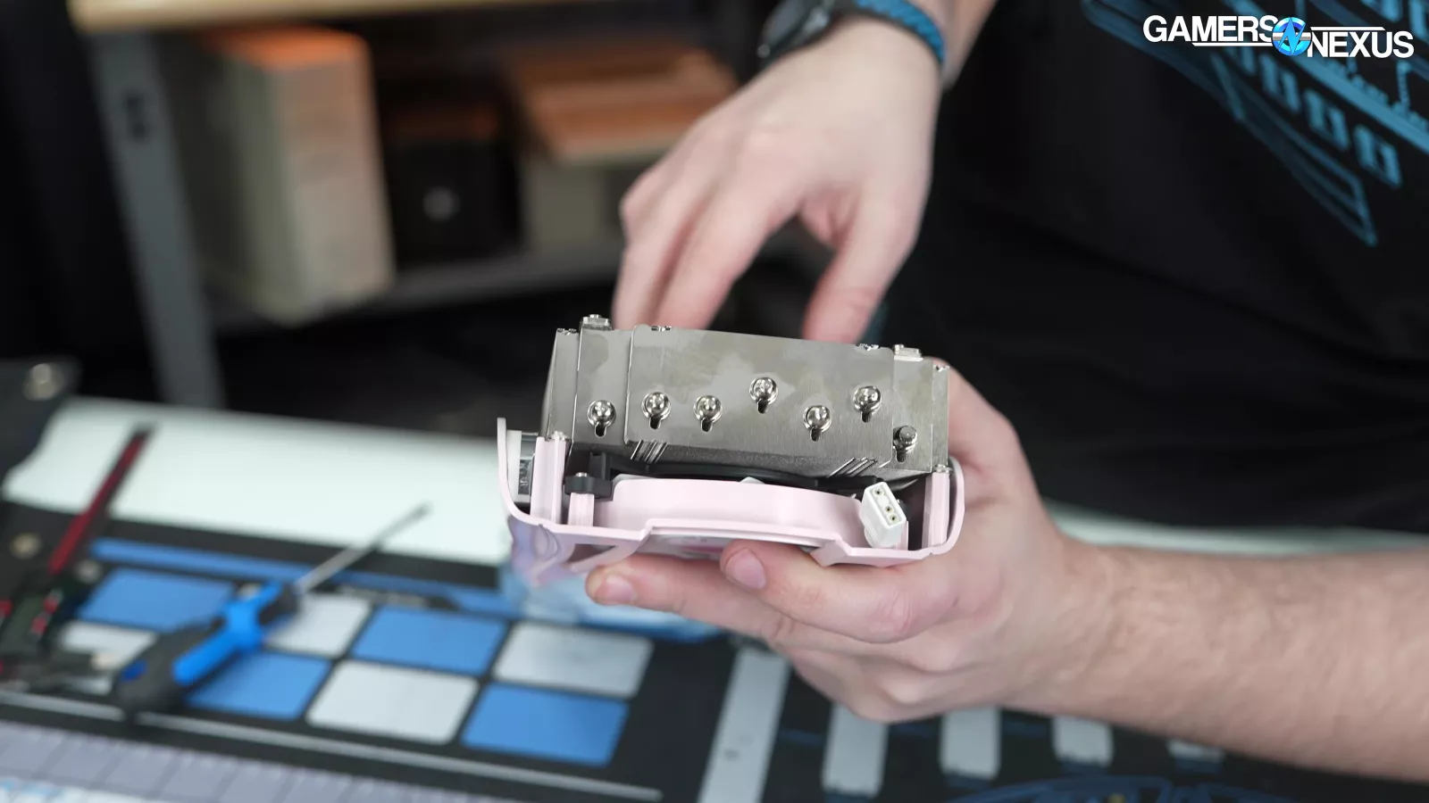 To release the shroud from the fin stack, we had to remove 4 screws. One of the screws featured a cut-out to accommodate a screw driver, which is a nice design.