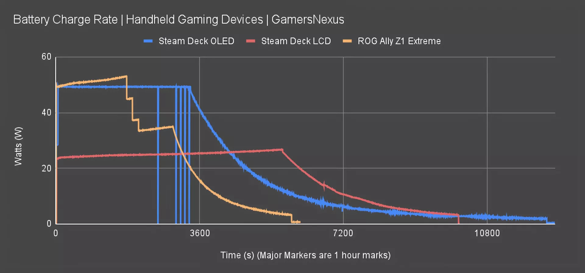 The Deck OLED pulled 50W at its peak, measured at the wall and not the output, with brief dips near the 55-minute mark. That’s where the rate of charging drops into a typical curve. We found that the Deck LCD only pulls 27W at most under these conditions. The Ally completed its charge in about 98 minutes, making it the fastest of these. Its curve is also the most aggressive, with a stuttered stair step and higher initial draw.