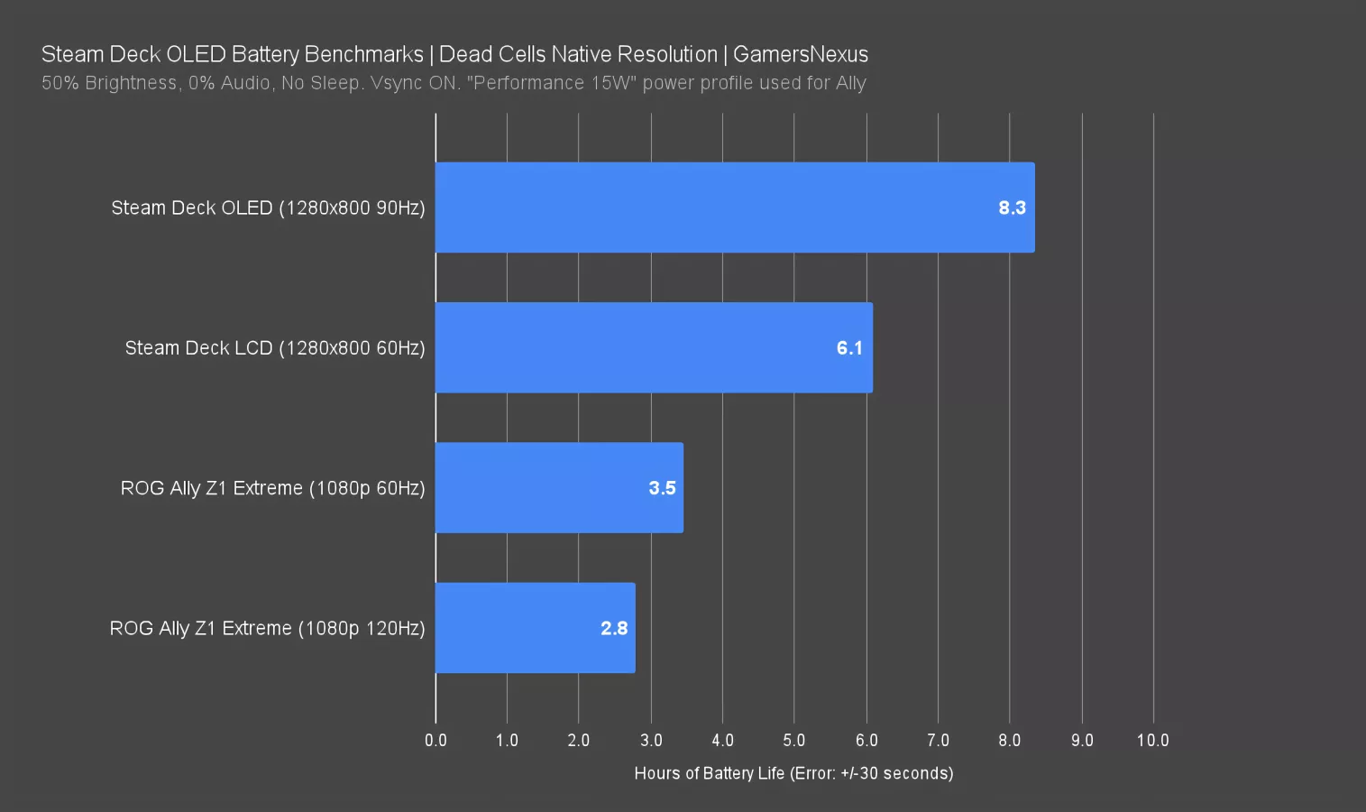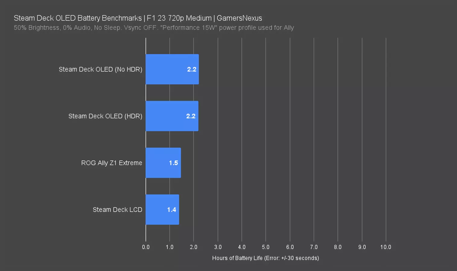 The Ally in Performance mode slightly outperformed the Deck LCD. The OLED handily beats both by more than half an hour of playtime, which is definitely noticeable in the real-world, and regardless of the in-game HDR setting: that's a 57% increase versus the LCD, and a 47% increase versus the Ally Z1 Extreme in Performance mode with those VSync settings as listed.