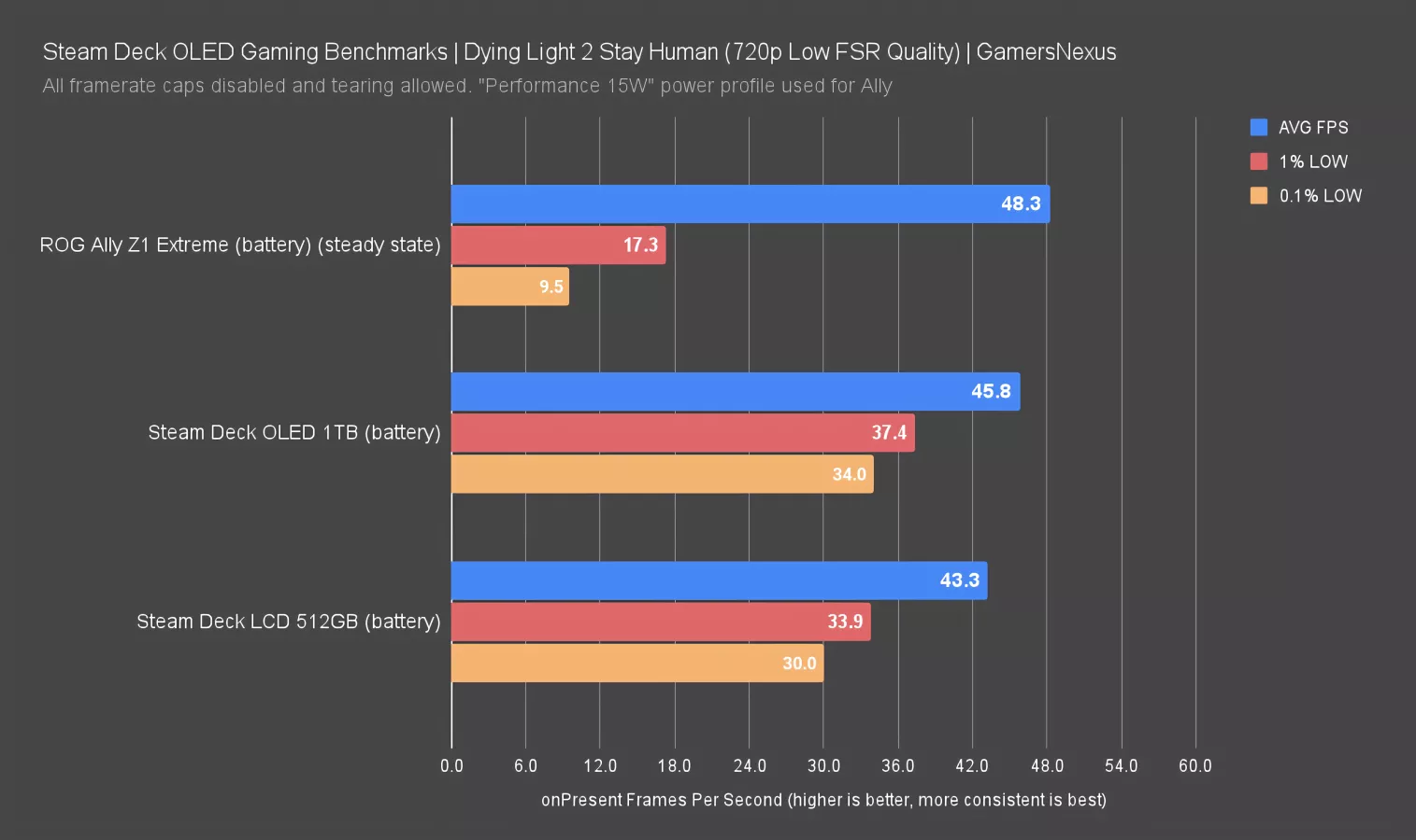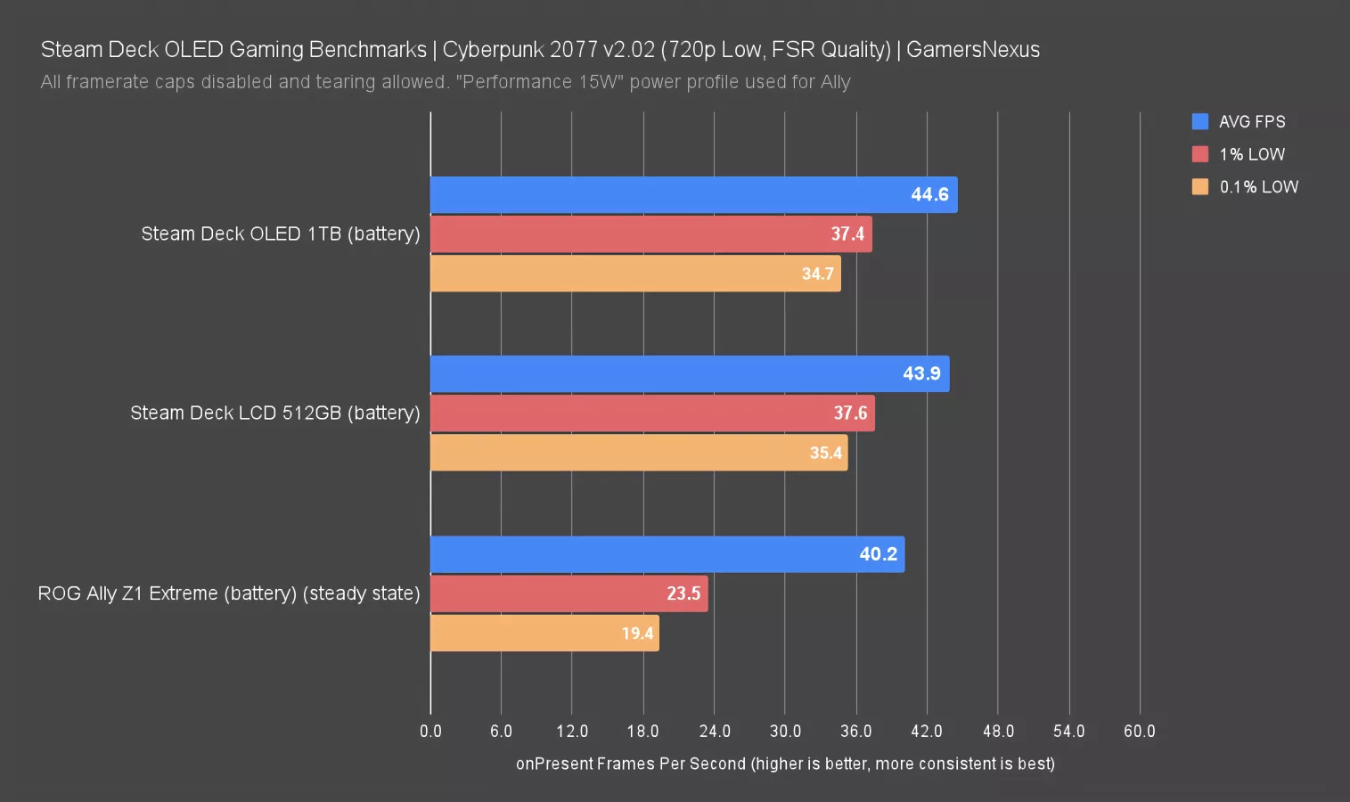 Cyberpunk, with our tested settings, had one of the least significant deltas. We tested in Dogtown, part of the Phantom Liberty DLC, at 720p Low with FSR 2.1 set to Quality. At those settings, the LCD averaged 44FPS, the OLED averaged 44.6FPS, a 1.6% improvement. The Ally Z1 Extreme is behind the LCD, as it was in our review months ago, although the Ally is capable of massive performance improvements on wall power that the Deck can't equal.