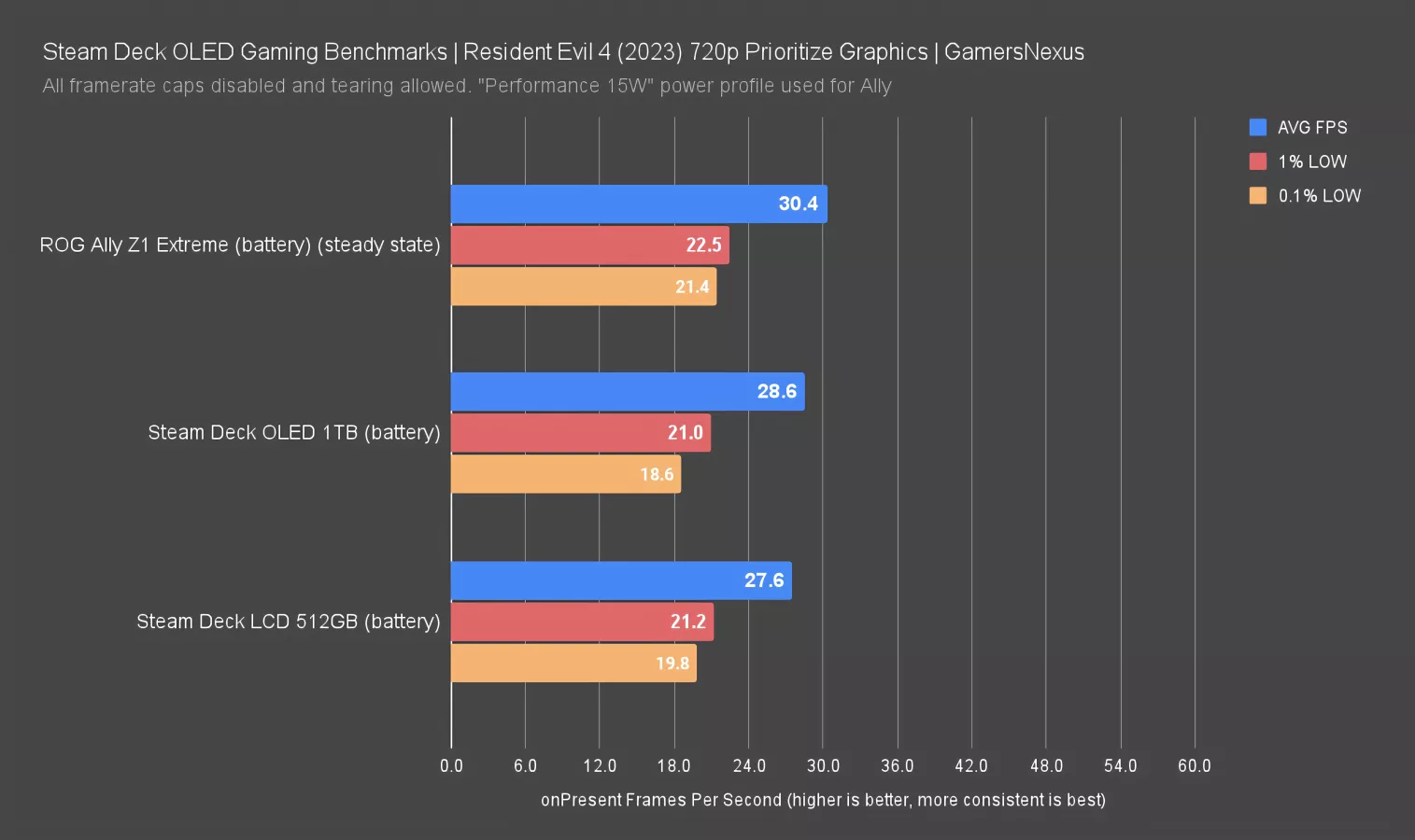 Resident Evil 4 at 720p with the Prioritize Graphics preset is pushing what these devices can manage, but the OLED handled it a little better than the LCD, with a 4% improvement from 27.6FPS average to 28.6FPS. The Z1 Extreme improved its position from last time we tested, pulling ahead of the OLED by 6.3%, at 30.4FPS average with stable lows. That’s a major relief for the Ally and is more in-line with what its hardware suggests it should be capable of and it really needs that support here.