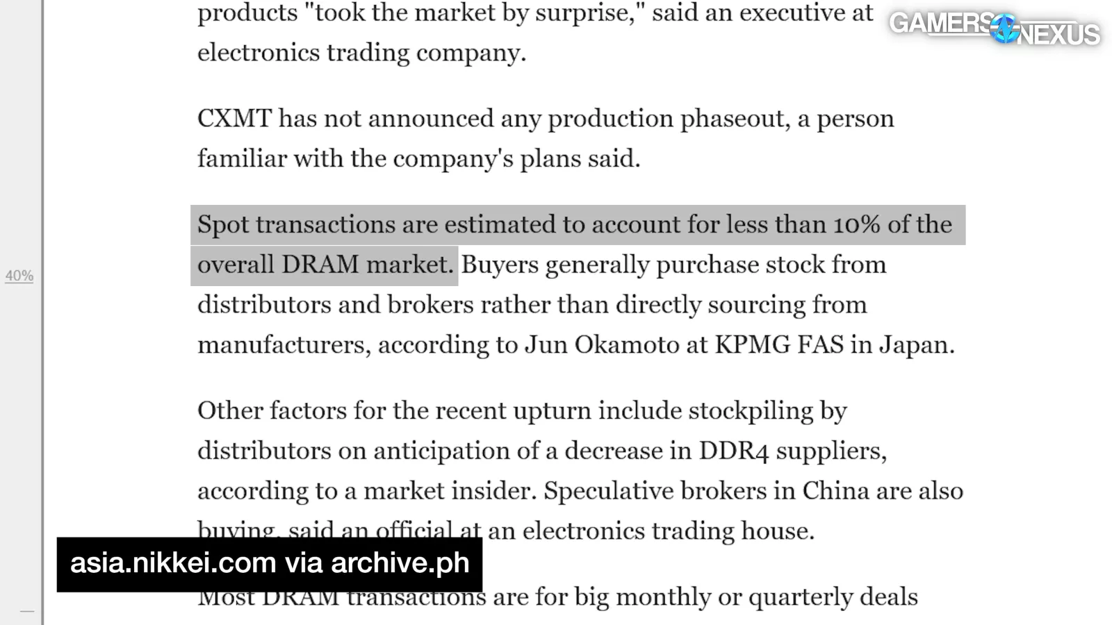 Nikkei Asia Review states that “spot transactions are estimated to account for less than 10% of the overall DRAM market,” noting that DRAM distribution tends to go through middle-people rather than direct sourcing.