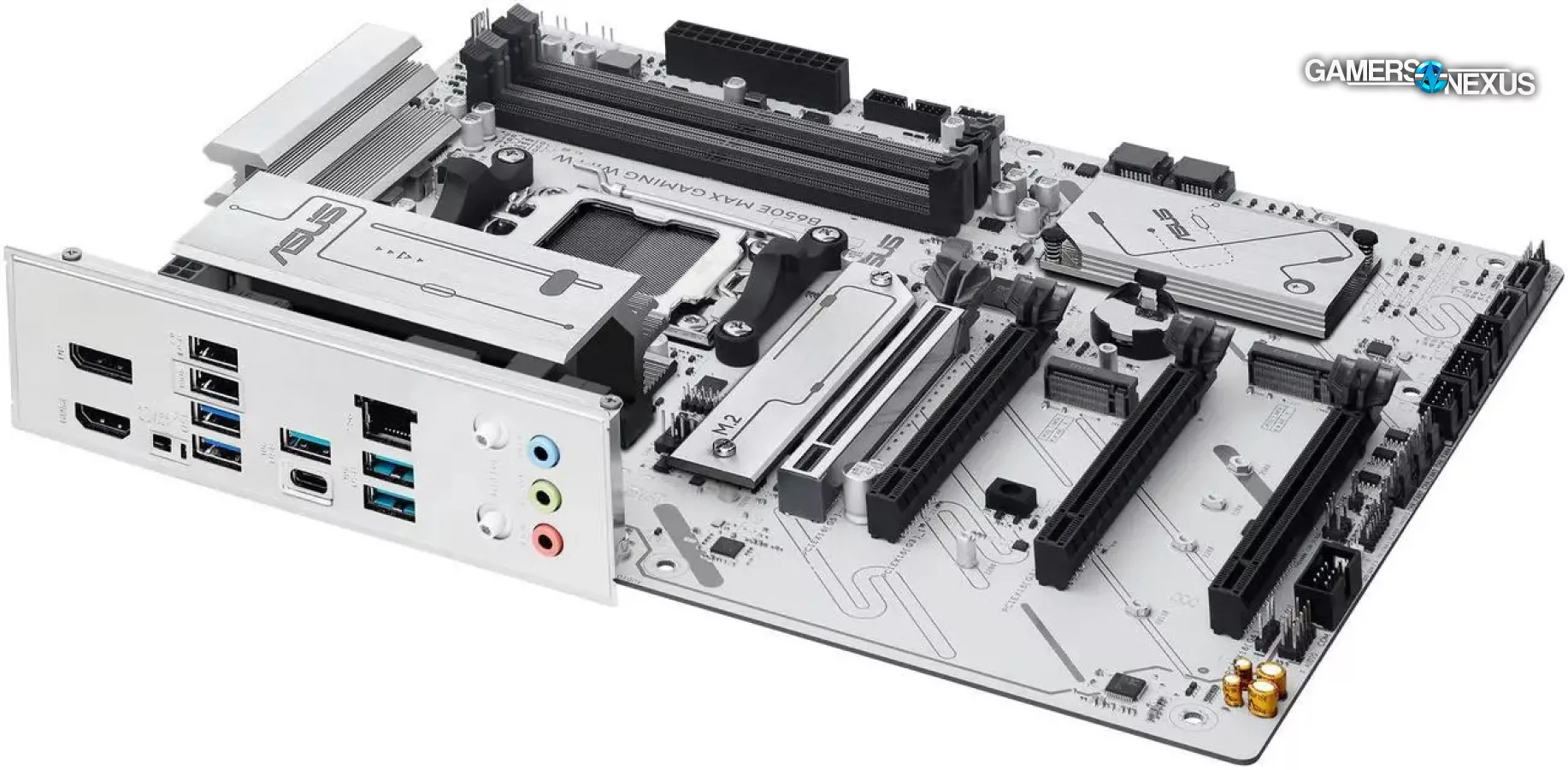 The motherboard for this build is the ASUS B650E MAX GAMING WIFI W. It features PCIe 5.0 for the main PCIe graphics (PEG) and M.2 slots, two additional Gen 4 M.2 slots (one with only 2x PCIe lanes), 8x total rear USB ports, 2.5Gb LAN/Ethernet, WiFi 6E, and BIOS flashback.