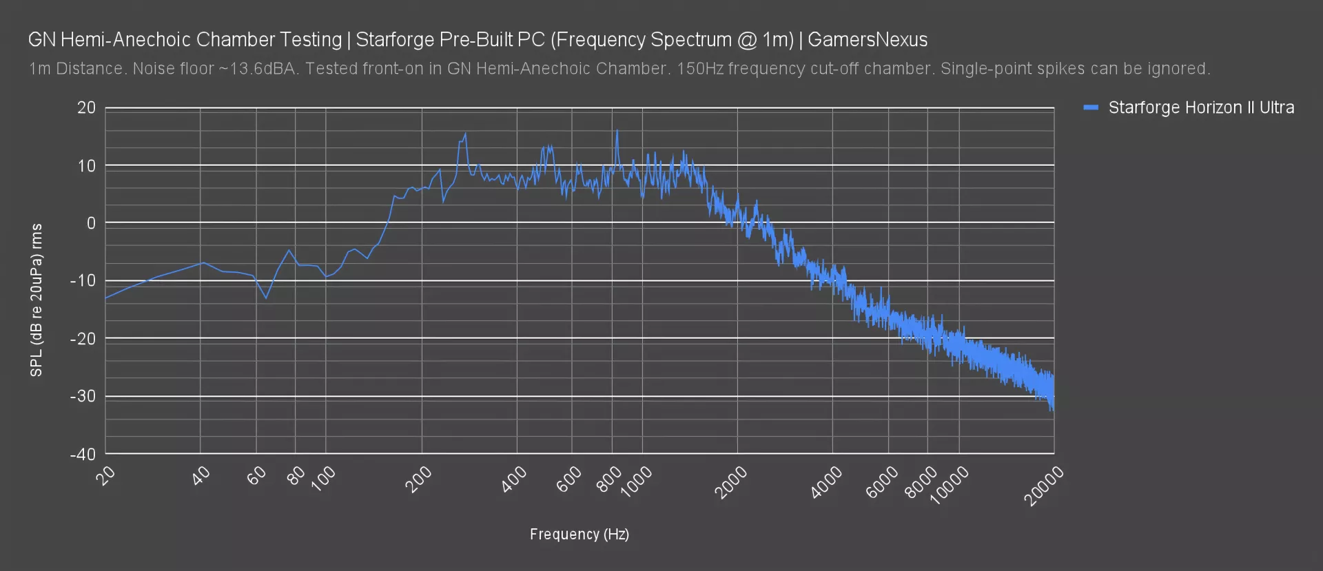 At steady state load and under peak thermal stress, Starforge’s fan profile has the highest range between 200Hz and about 1400Hz. Fall-off around the sensitive range means that we end up with what is mostly a lower frequency hum that you might define as “background noise."