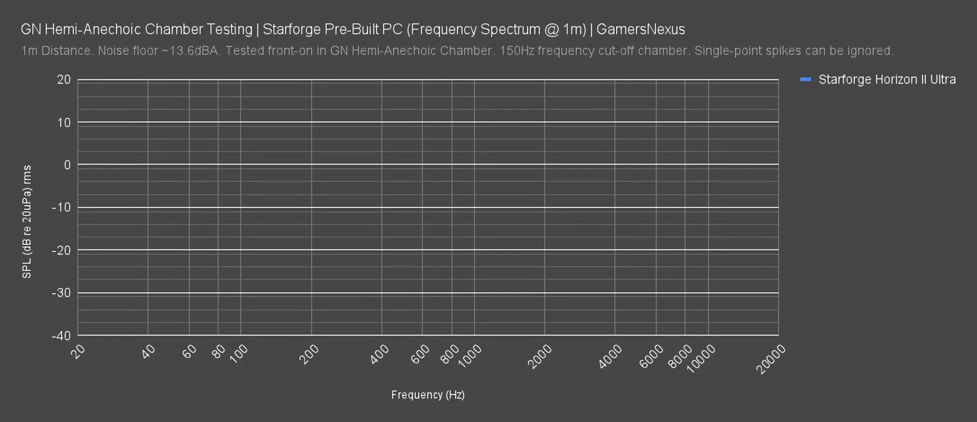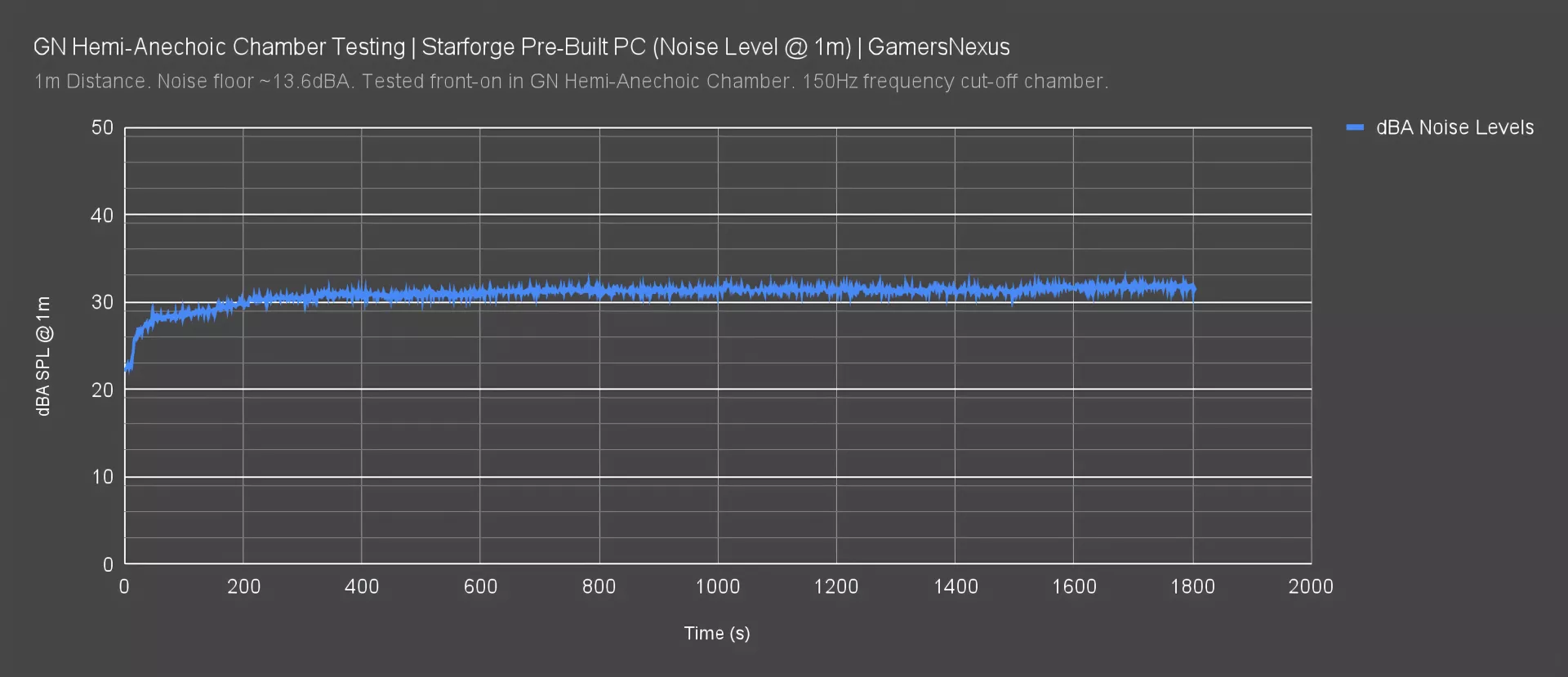 This testing is conducted at a 1 meter distance. We collected fan ramp data for 30 minutes to monitor the noise level over time, which allows us to evaluate Starforge’s preconfigured fan curve.