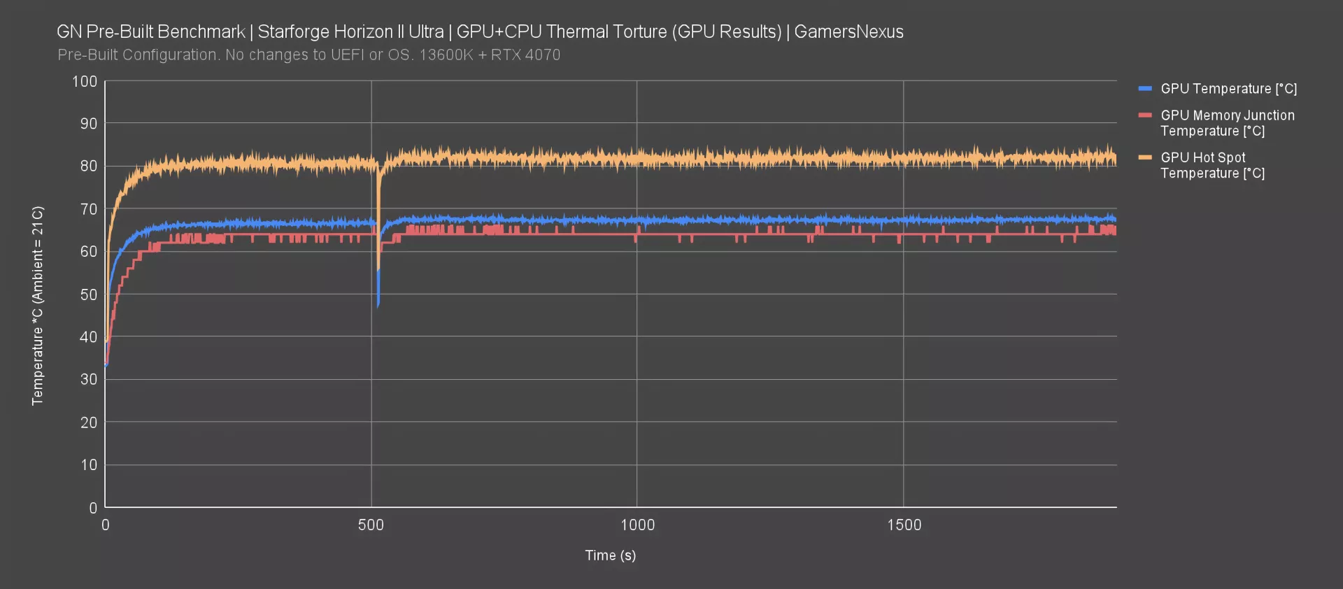 Here’s the chart with GPU thermals, plotting the average GPU temperature, memory junction temperature, and hotspot. These temperatures are first a factor of the card itself, which isn’t Starforge’s responsibility (but is something that they choose, so they inherit it) and then a factor of the case configuration.