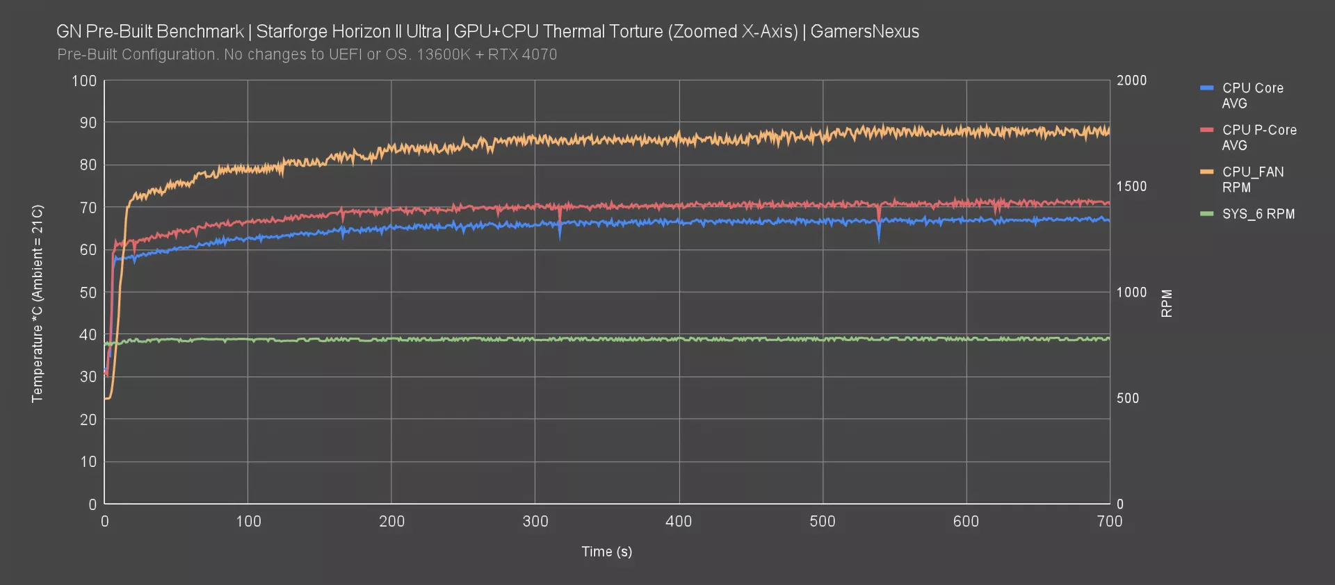 We wanted to front-load this because the system has a drawn-out fan ramp, with the hysteresis configured to ramp against thermals slower than we see in some of the other pre-builts we’ve tested.