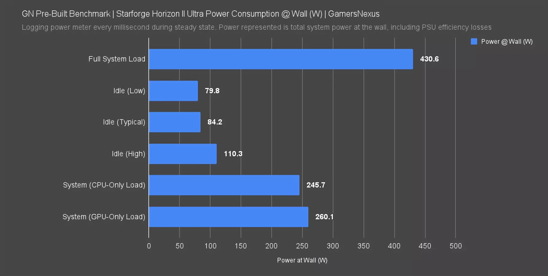 Time to look at power consumption. For this testing, we used a logging power meter at the wall to check total system power draw under various loads. The point of this test is to ensure that Starforge is specing an appropriate PSU wattage for the build.