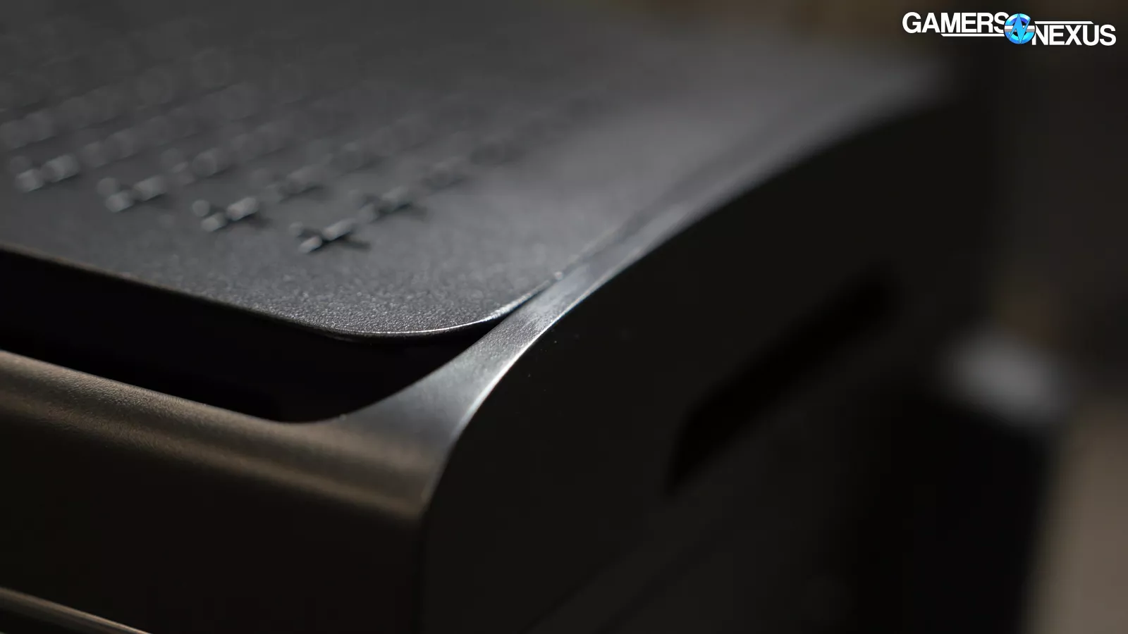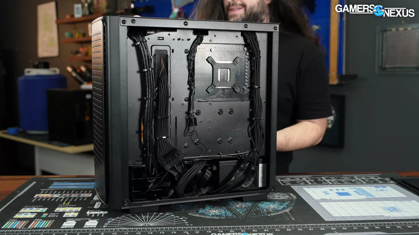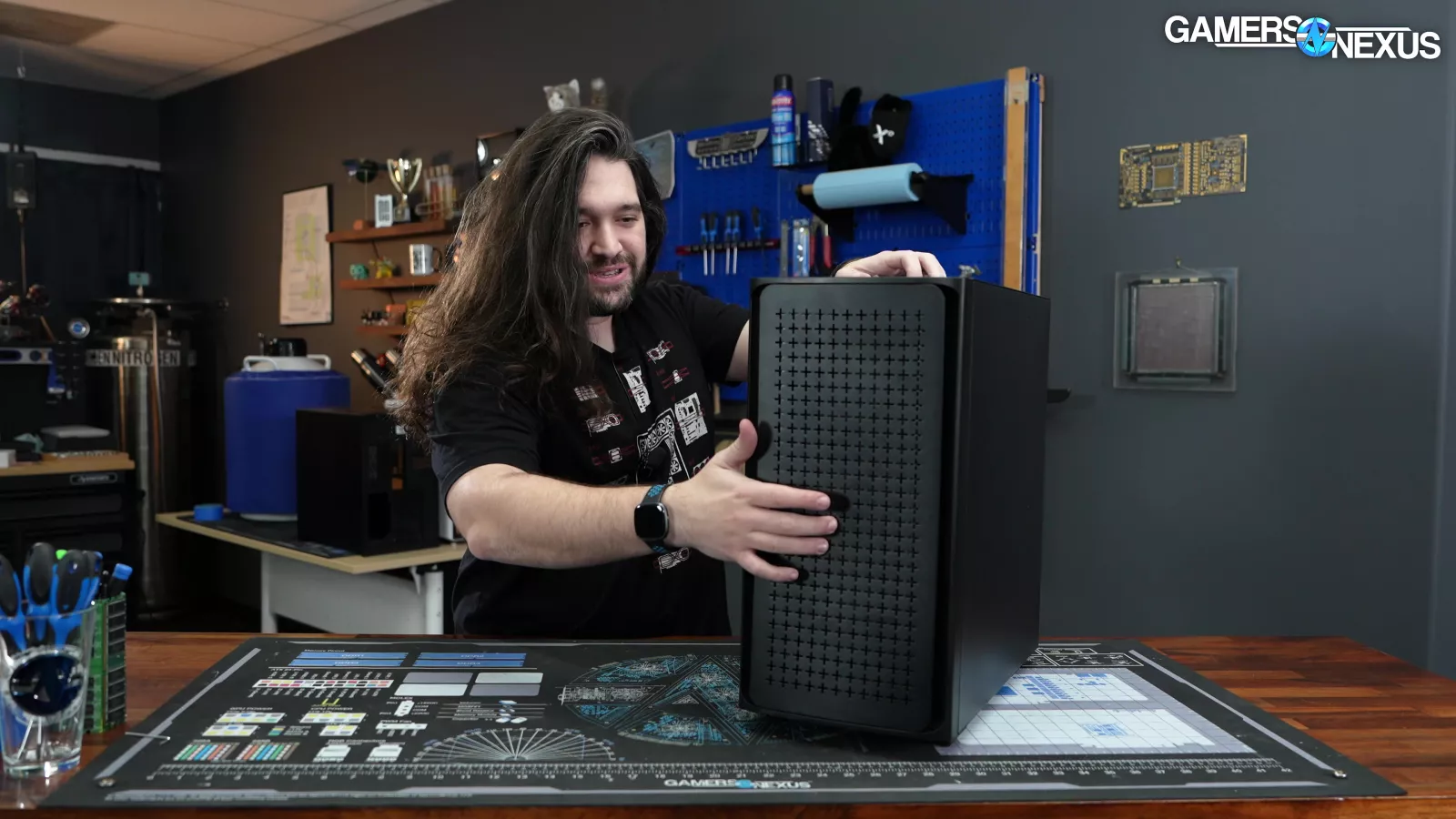 Taking a look at the front of the case again, it has some of the worst perforation achievable on a panel and doesn't offer much ventilation. The porosity is exceptionally low on the front panel, meaning high resistance to flow at air intake and more acoustic downsides. The reason it can still breathe is because of the side intake, which doesn’t have a ton of room, but is sufficient with the fan count.