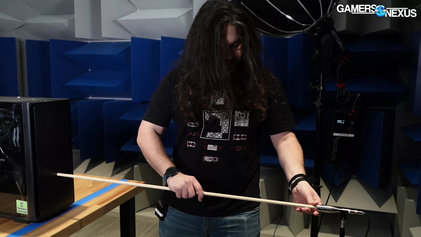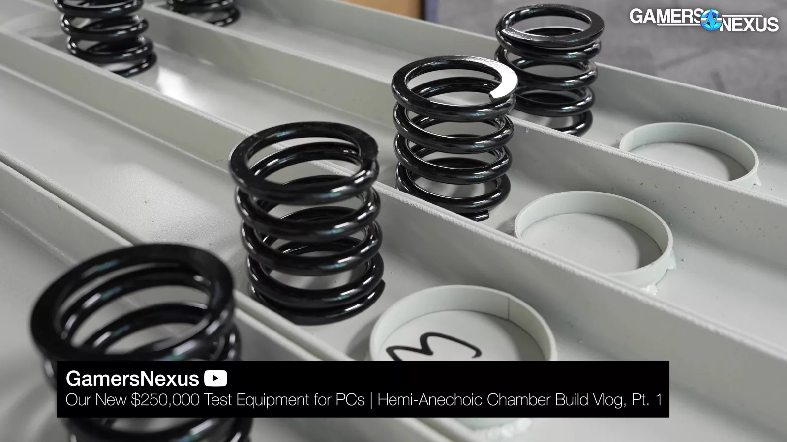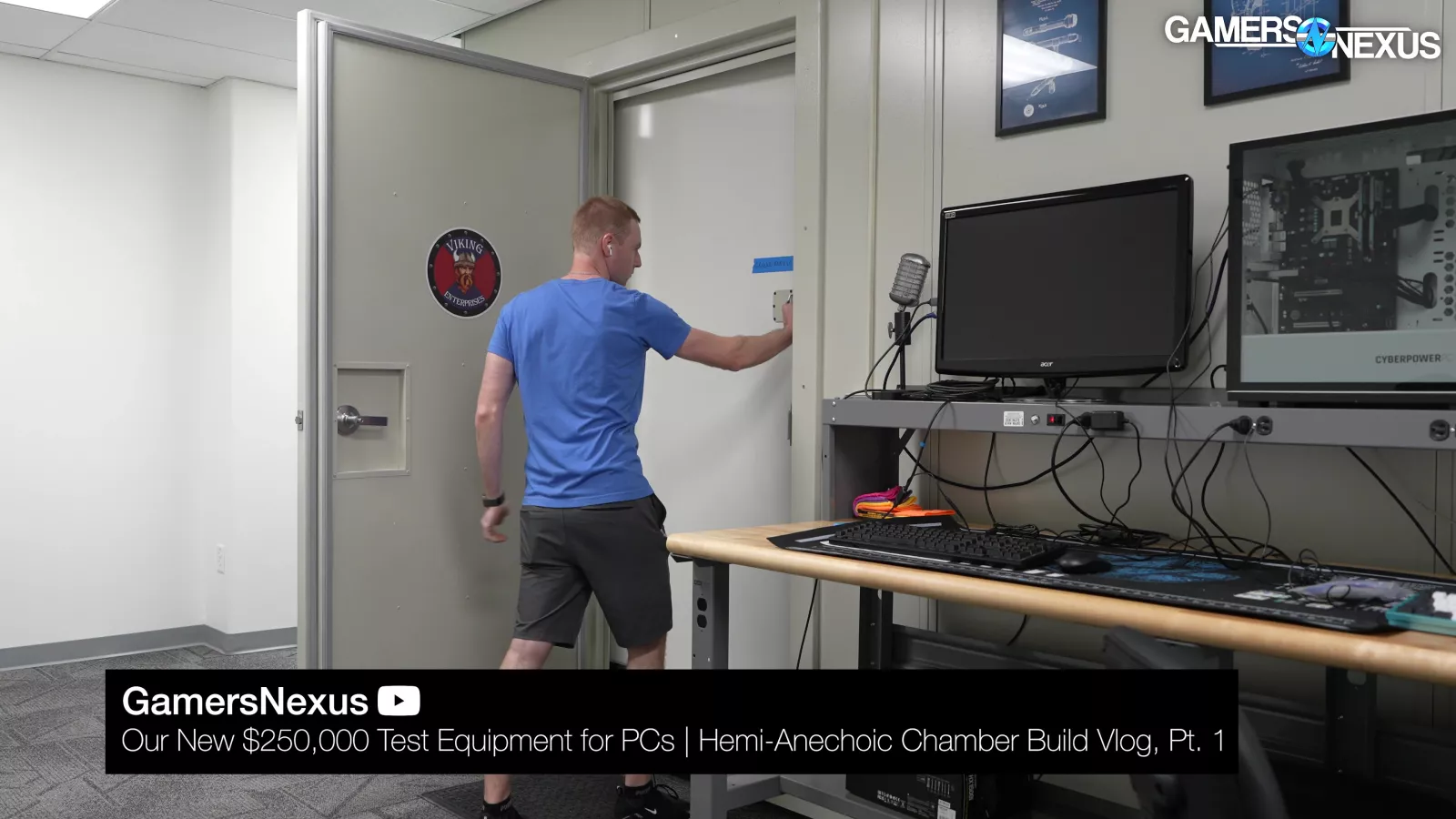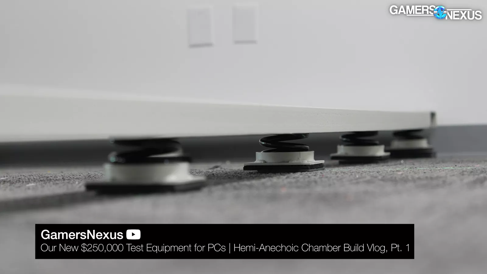 On top of the chamber, we have insulation stacked to further reduce external noise, and surrounding it, we use special Armstrong ceiling tiles. The chamber also utilizes 8-foot silencers on either side in the event we run air handling, and for the single point of noise ingress, we use two heavy gauge steel doors that nest and are packed with insulation, including more wedges on the back side. Between the instrumentation, the external room, and measurement equipment, and the complicated chamber itself, we spent about a quarter million dollars on this testing equipment and have been thrilled with the results so far -- and we’re still only just getting started. We also have a separate video transparently detailing the construction of this chamber.