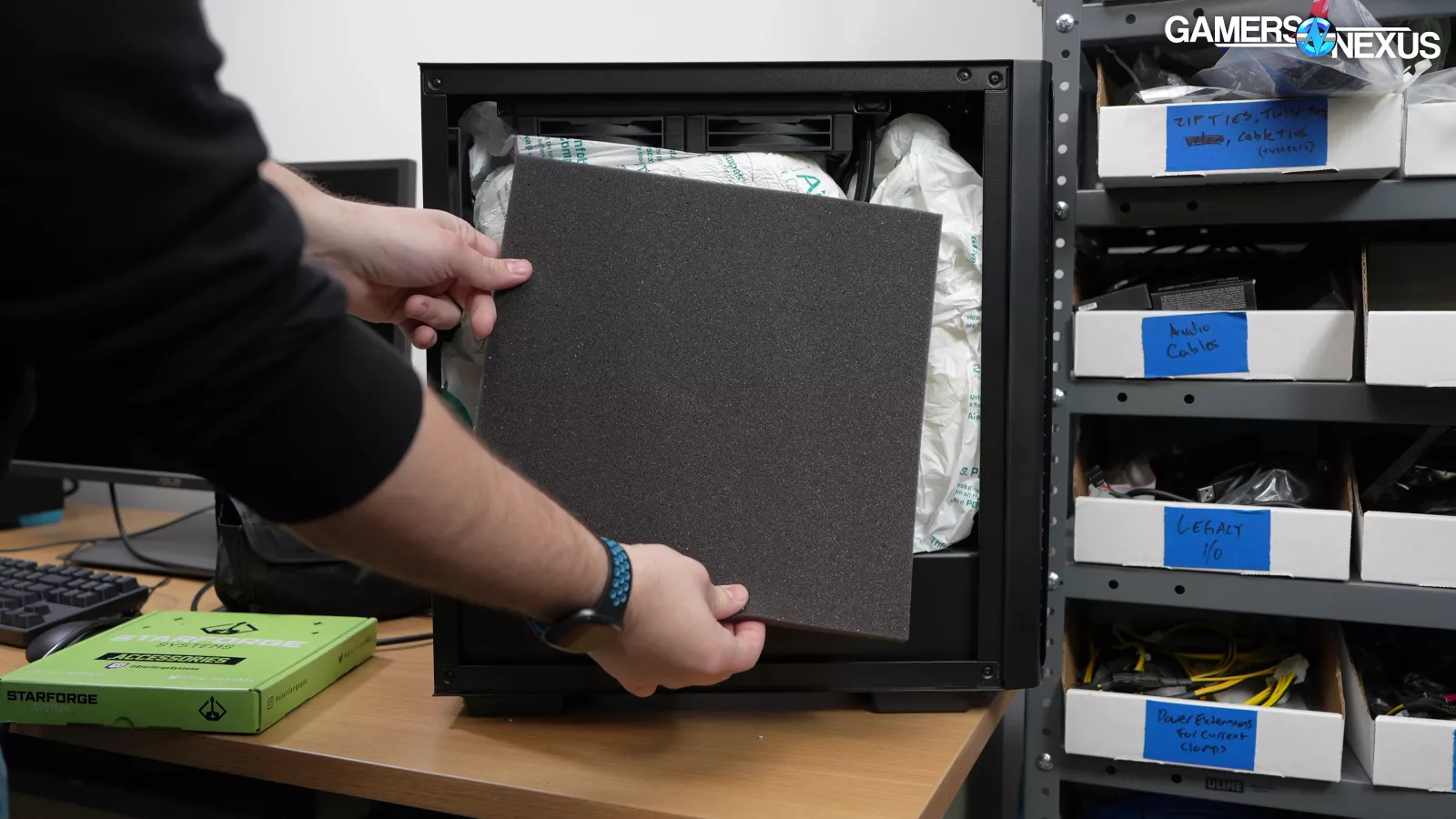 Starforge used three of these Instapak blocks in the system: One was wrapped tightly around the GPU, another was around the CPU cooler in a way that butted-up against the GPU Instapak, and the final was at the front of the system. As far as packaging goes, this is a heavy use of Instapak for an SI, and that’s a good thing.