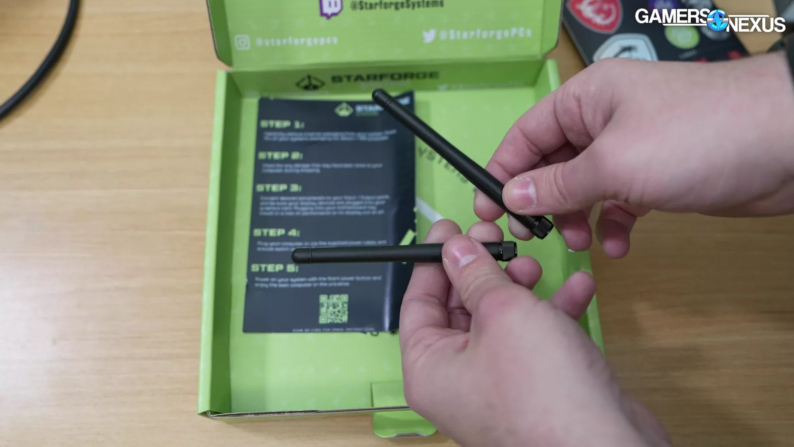 Inside the box was a bag of extra power supply cables, which is great as the modular PSU can make use of them in future builds, and a Starforge accessories pack. The accessories are slim for this one and basically amount to motherboard items: It includes WiFi antenna, a 16 AWG power cable, a metallic sticker pack, and a 5-step installation instructional card with a QR code for a manual.