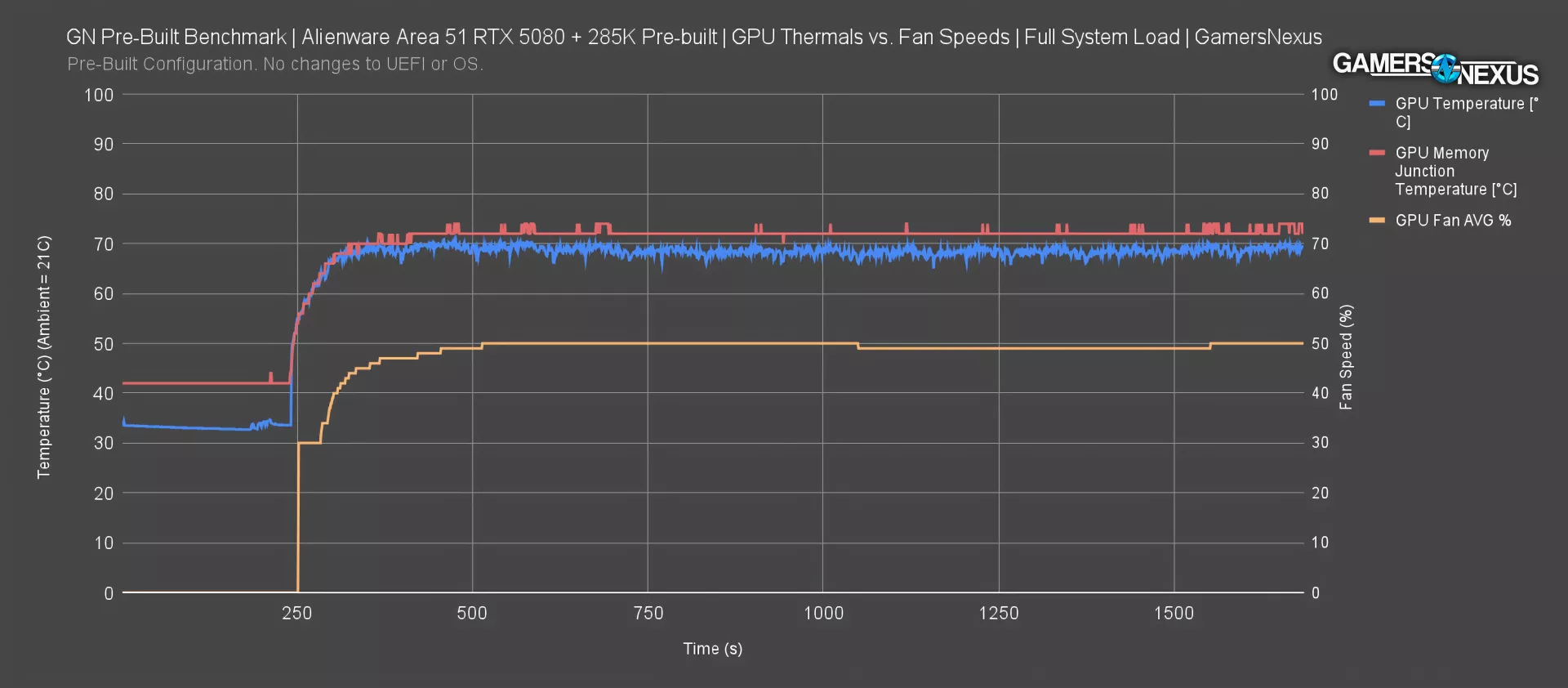 Next, we’re manually controlling the fan speeds to do some A/B testing to evaluate Alienware’s design choices. We connected all the fans to a Corsair fan controller preloaded with PWM values that roughly correspond to the values at steady-state under Alienware’s control. The GPU fans were fixed at 50%.