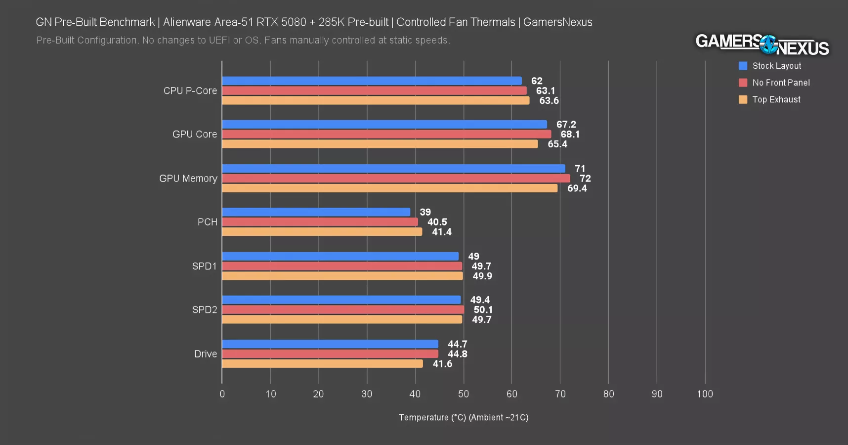 Broadly speaking: Removing the front panel had no meaningful impact on results and was within error. Top exhaust significantly improved drive temperature, GPU memory temperature, and GPU temperature for the core, with reductions of about 3 degrees in each. The GPU temperature in particular improves because of the better ability to utilize flow-through cooling, evicting warmed air out the top of the case in a straight path for the GPU. This naturally heats up the CPU radiator more, which means CPU temperature slightly increases. The CPU can take it though, and the GPU will actually boost slightly higher as a result of this. Likewise, the CPU temperature increase is less than the GPU temperature decrease.