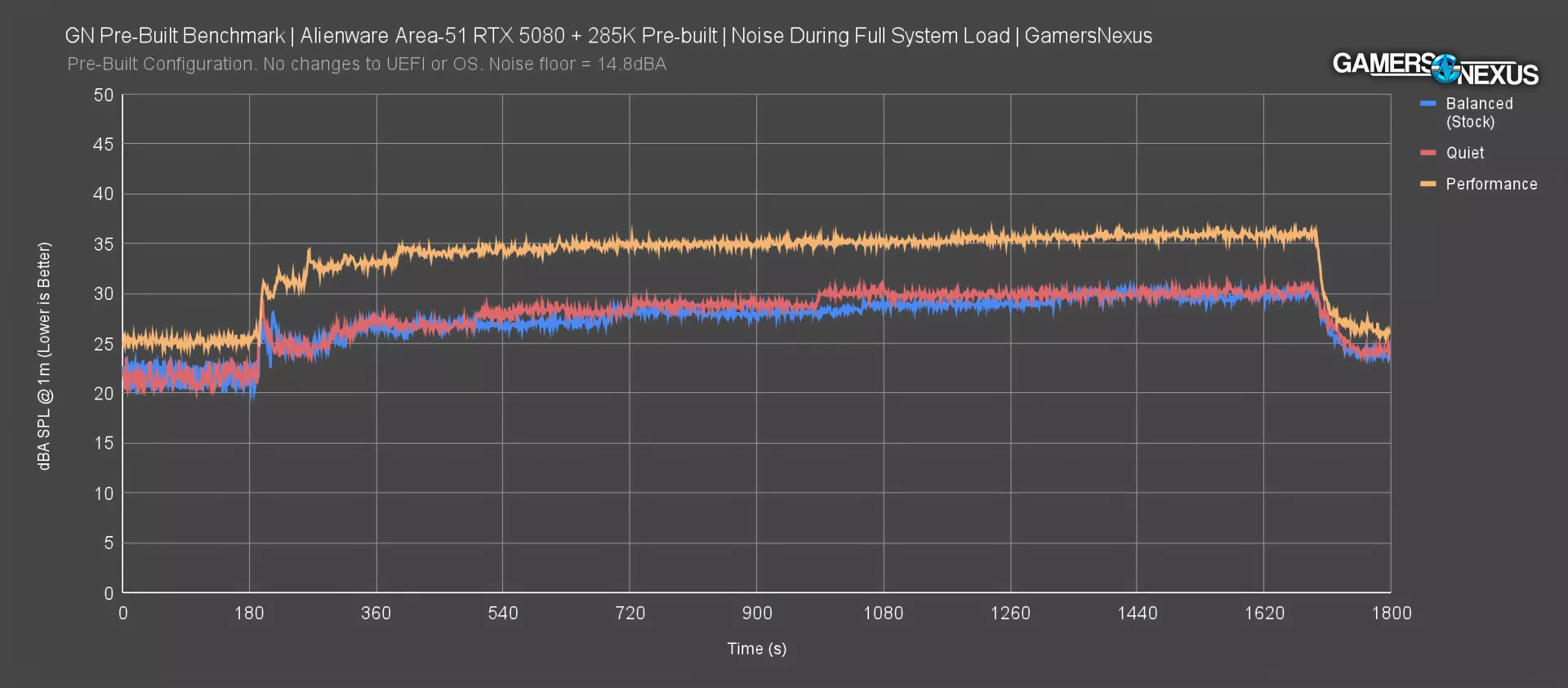 The Quiet profile follows much the same pattern – actually measuring slightly louder than Balanced during parts of the test. This reflects the extremely similar thermal behavior we saw between Balanced and Quiet.