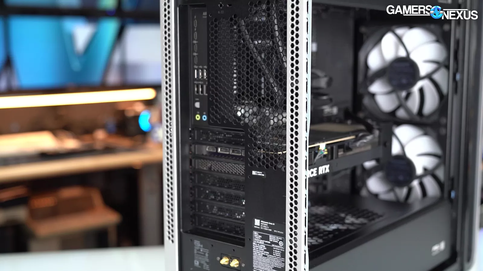 Alienware went with a traditionally laid out large tower case with far more ventilation than its past designs. As a reminder of how bad it’s been before, we made an entire video “fixing” the dumpster fire known as the Alienware R13.
