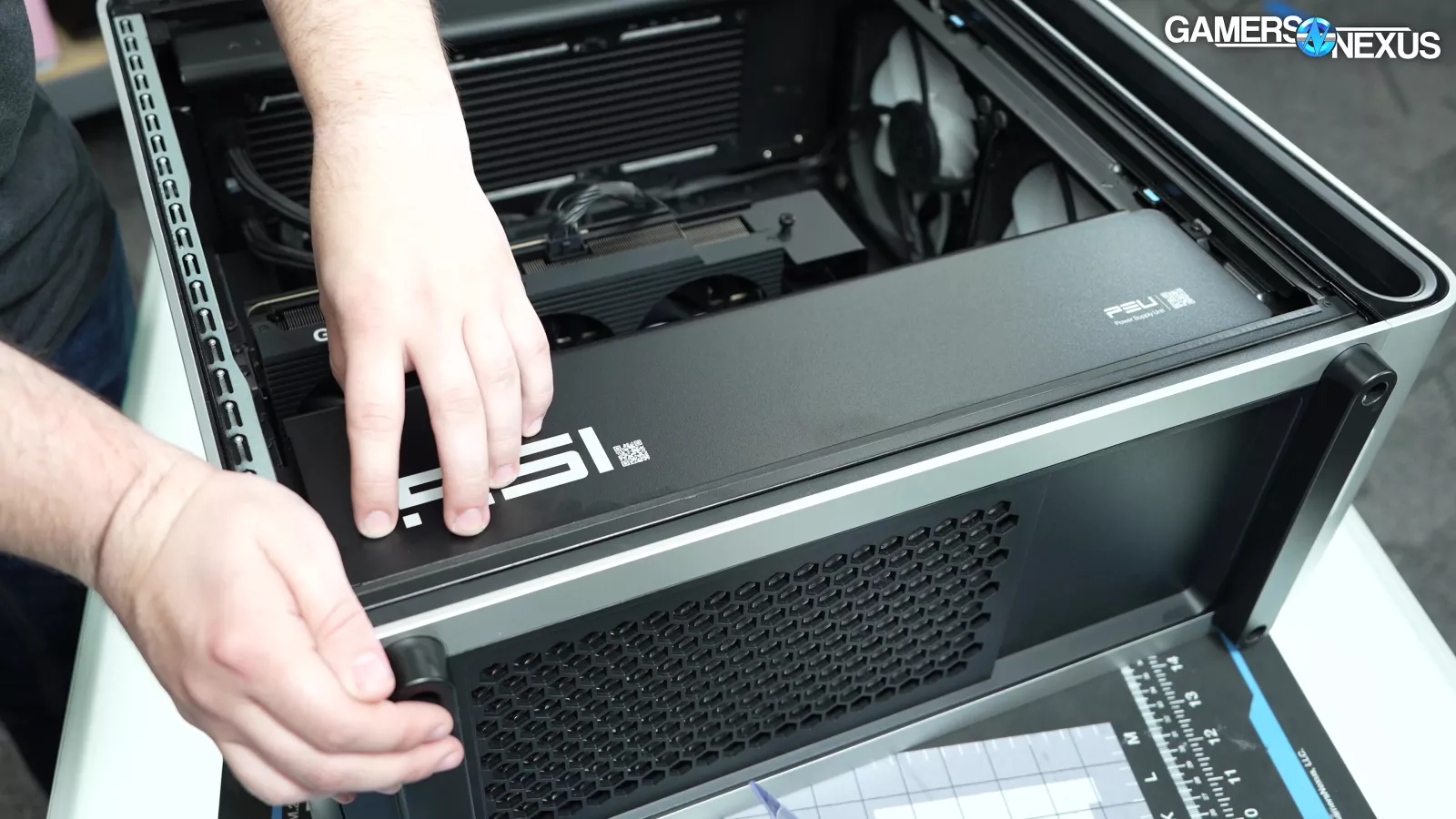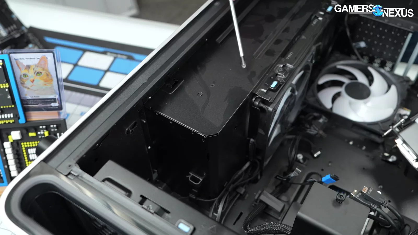 Opening up the PSU shroud enclosure, and removing the back-most fan, we can see it doing functionally nothing as it’s right up against the power supply. The case’s 2 grills also add impedance as well. Looking at the bottom of the system, there isn’t a lot of room for air to come up through.