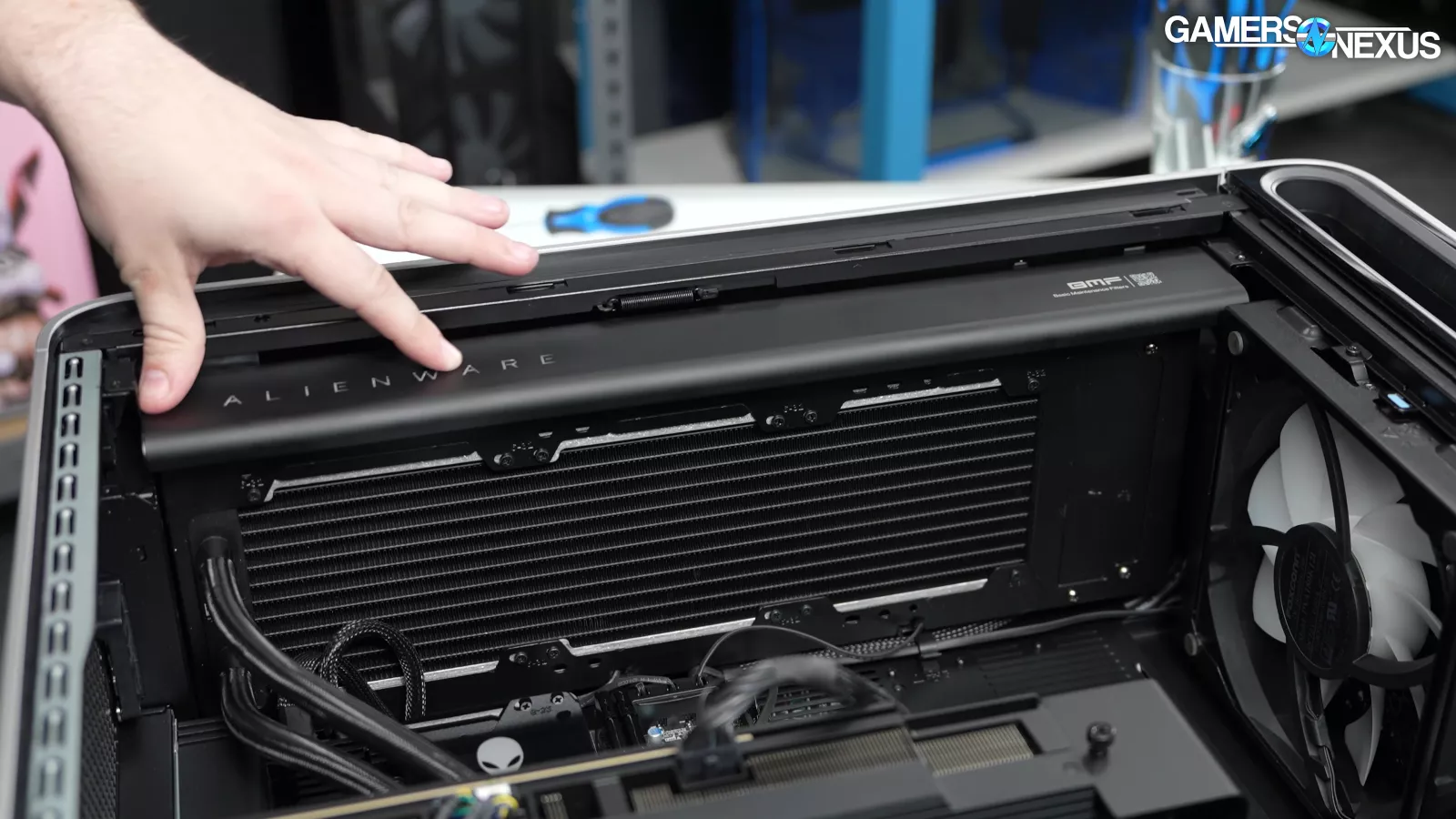 The top of the case has a bar that covers the side of the radiator, which has been in past Alienware systems.