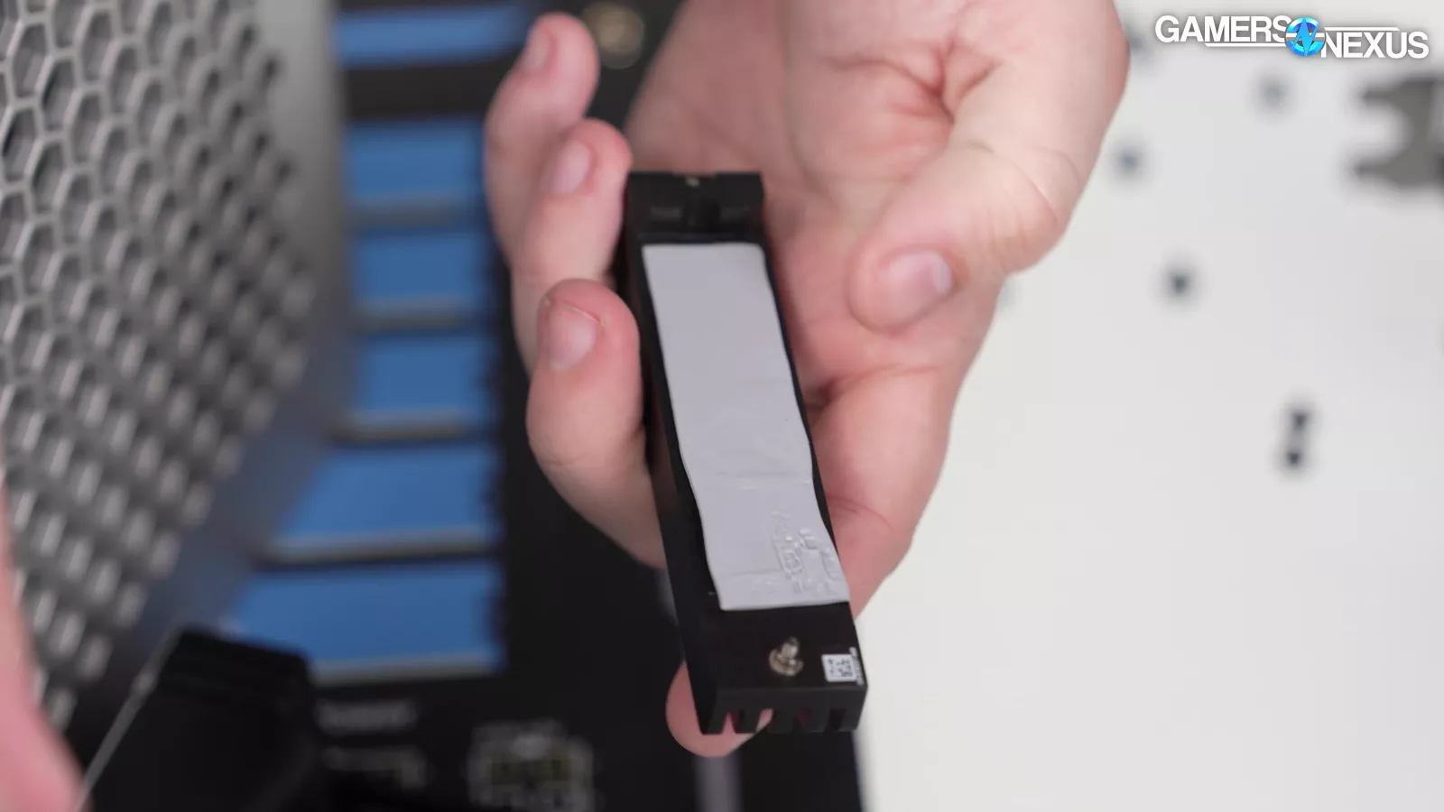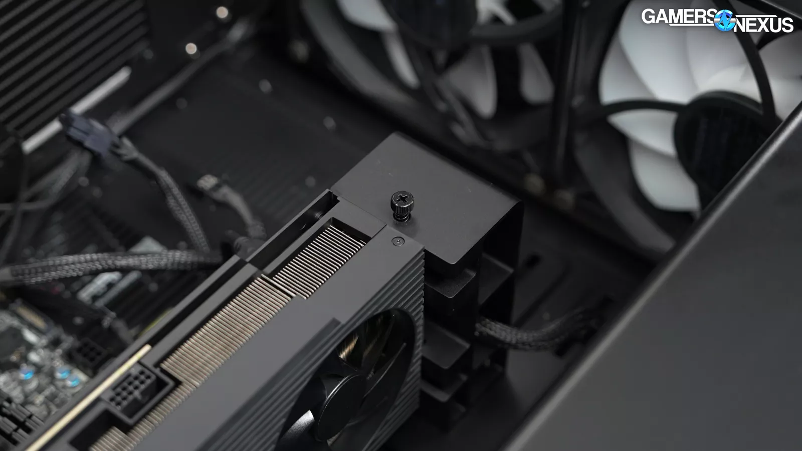 The RTX 5080 inside is held in place by the most substantial GPU bracket we’ve ever seen. It’s a chunk of solid metal attached to both the end of the GPU and the internal wall of the case and it slides into place. It’s pretty nice, but totally unnecessary and adds to the expense. It does somewhat make sense in a pre-built to prevent breaking during shipping, however.