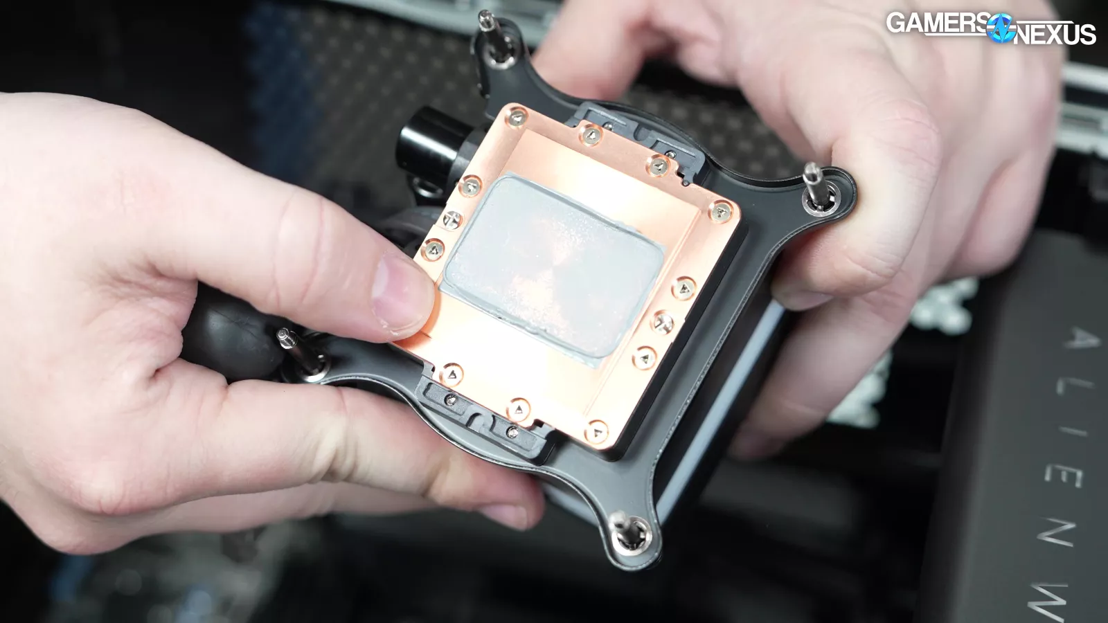 Removing the pump block, we can see a thermal pad was applied underneath. The paste pattern is a bit lacking in spots.