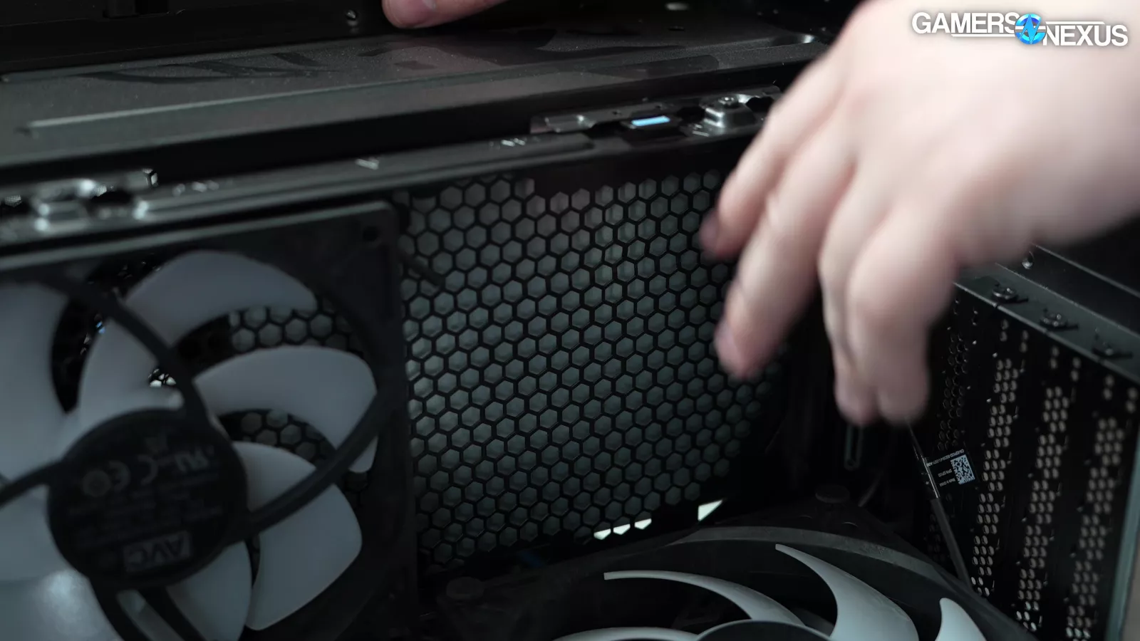 On the new system, the top, front, and most of the bottom are all air intake areas, leaving the meshed-out rear as a totally passive exhaust. Particularly interesting are the two 180mm fans in the front panel, reminiscent of the Fractal Torrent. There’s roughly 35mm of clearance in the front cutout, which should be sufficient to avoid too much restriction despite looking covered. It helps that the hub loses the most access to air, and yet is the only part of a fan that air can’t go through. The dust filter inside the panel is magnetically retained for easier cleaning as well, which is a nice feature.