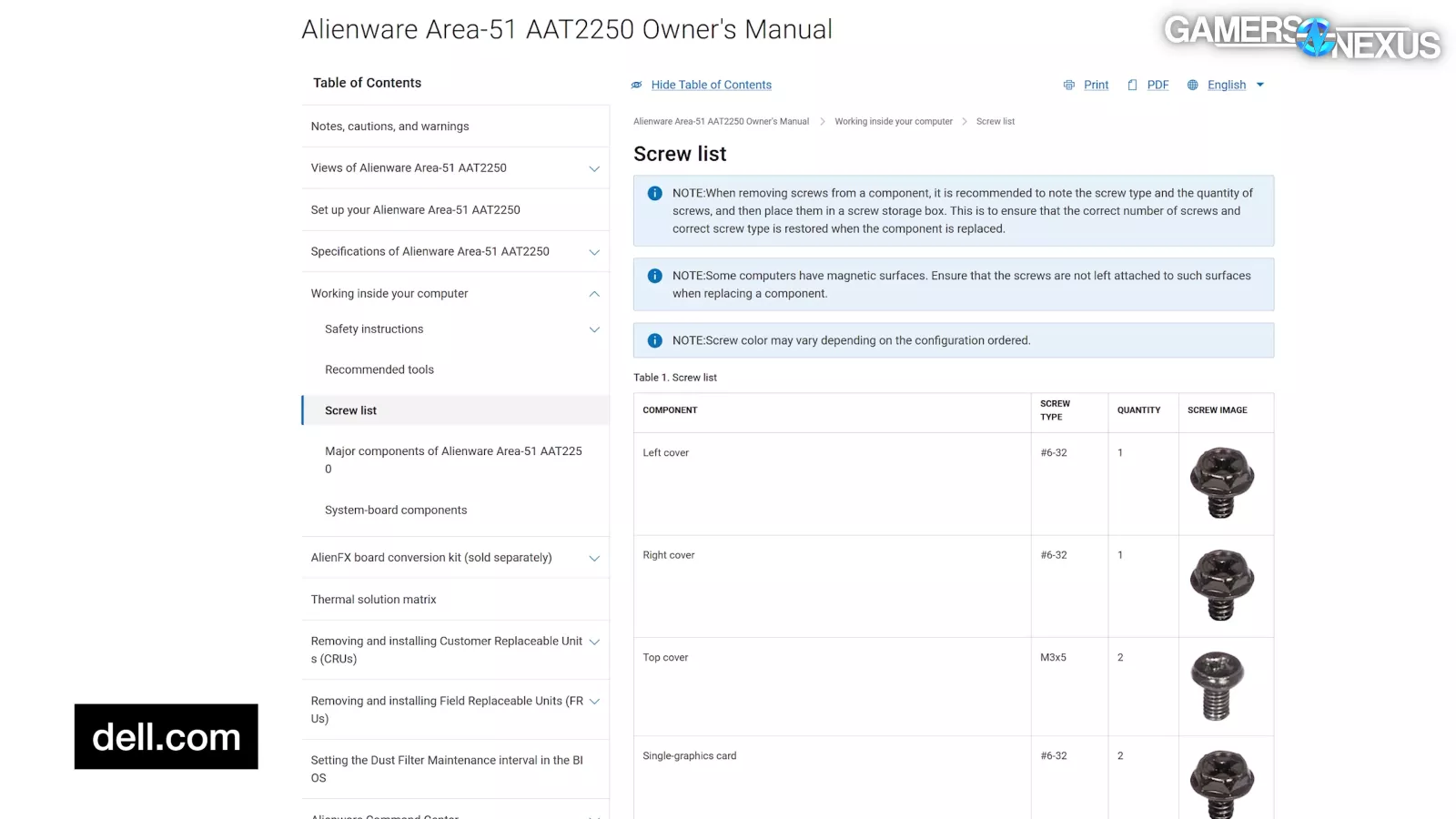The case is also covered in at least 7 QR codes that link to various sections of the manual. It’s detailed, including this cool exploded diagram of the system and a dedicated screw list. Alienware is actually making progress here. Using ATX12VO and LGA1851 is a limiter, but the parts are standard, and that’s a big improvement over the proprietary crap they’ve used in the past.