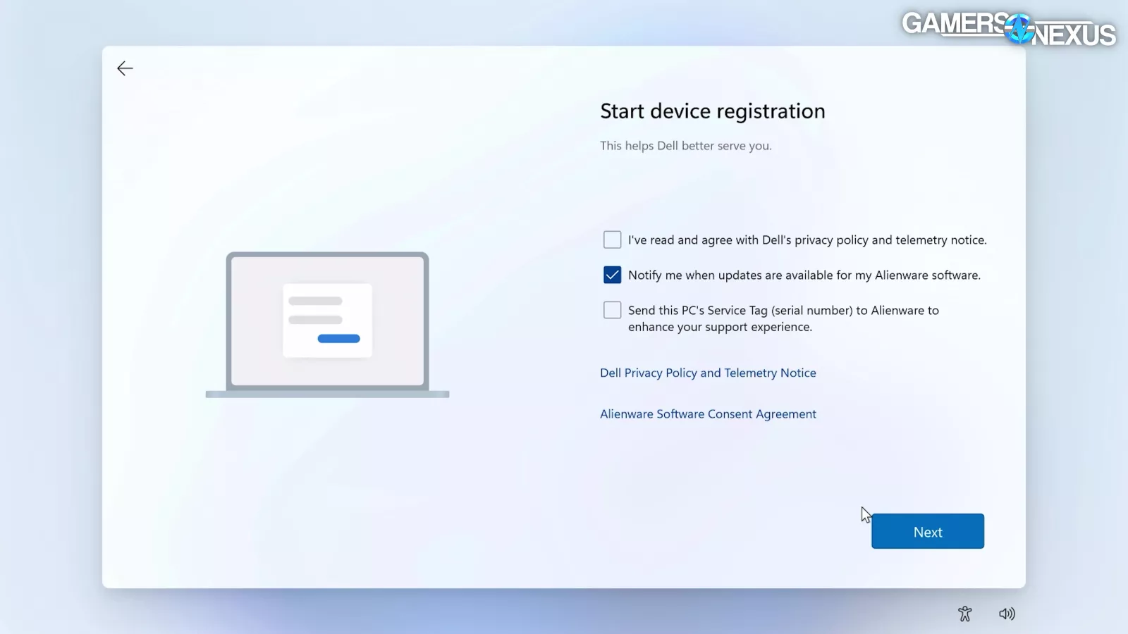The Windows installation process was modified to include a registration form and agreements to Alienware’s terms. We can never just get a clean Windows install from Dell. The good news is that you don’t have to fill them out or agree to them, you can just press next. The bad news is that it doesn’t tell you that’s even an option.