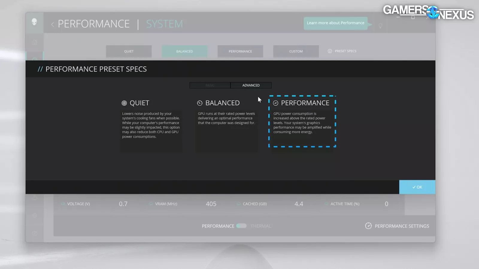 Weirdly, the performance page claims that Performance mode does this: “GPU power consumption is increased above the rated power levels. Your system’s graphics performance may be amplified while consuming more energy.”
