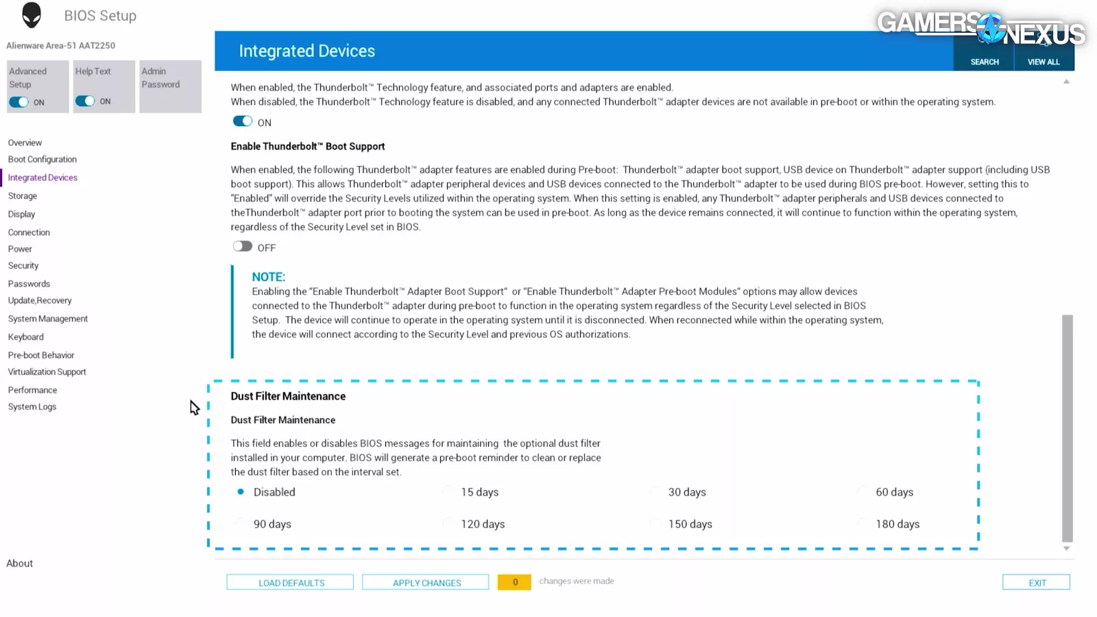 The BIOS is Dell standard with simple sections and a straightforward layout. Mildly interesting is the dust filter maintenance reminder setting, but it’s Disabled by default. This could be pretty cool if utilized properly.