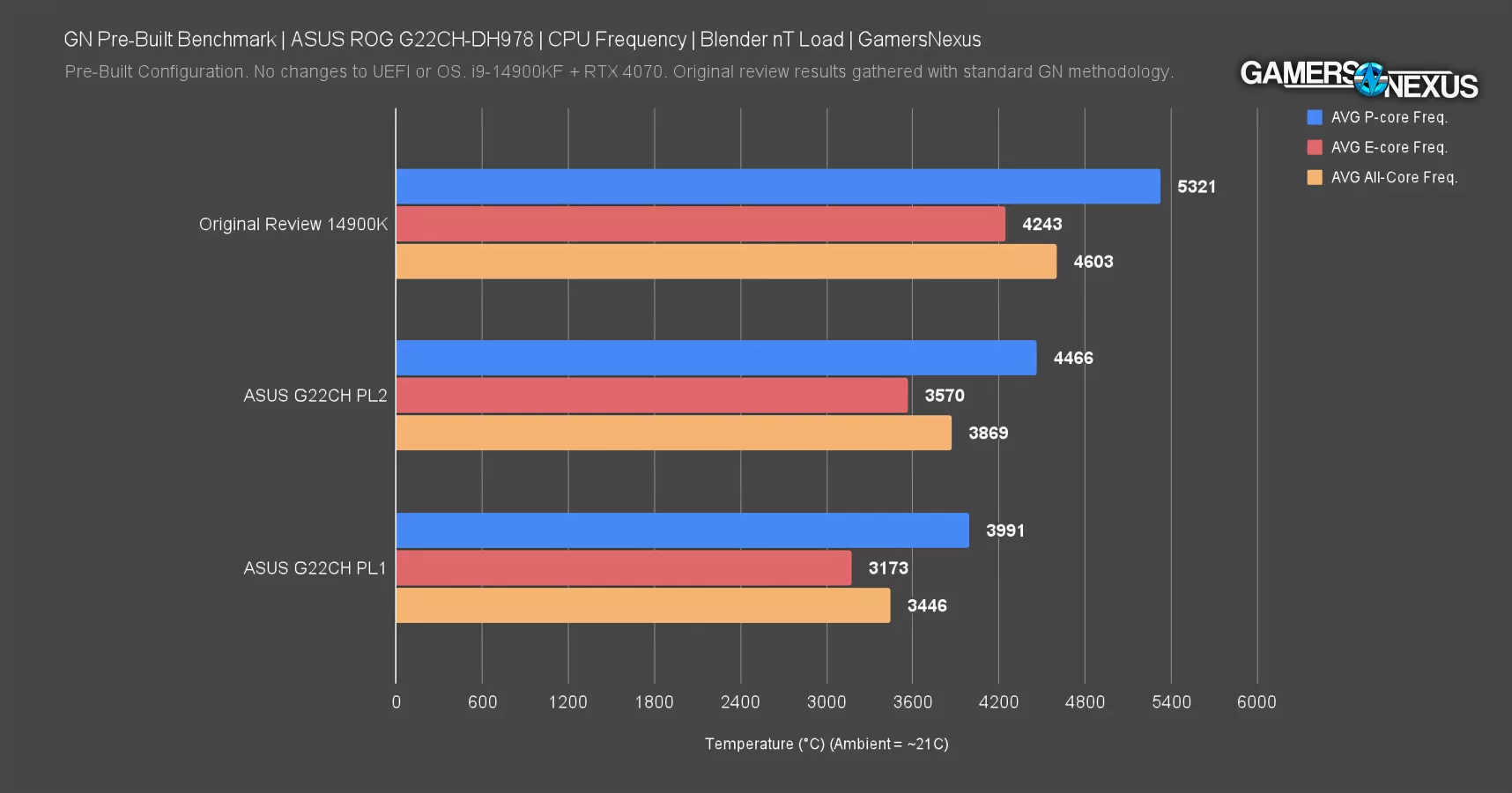 ASUS in its infinite wisdom has made a $2,500 pre-built computer, which absolutely guts the multi-thread performance of the Intel i9-14900KF inside with over 1.3 GIGAHERTZ of frequency drop. They have downclocked it back to the 9th Generation, and it’s objectively the worst delta away from what the CPU should be running at that we’ve ever seen in a pre-built PC. This is the worst version of a pre-built that we've ever reviewed.