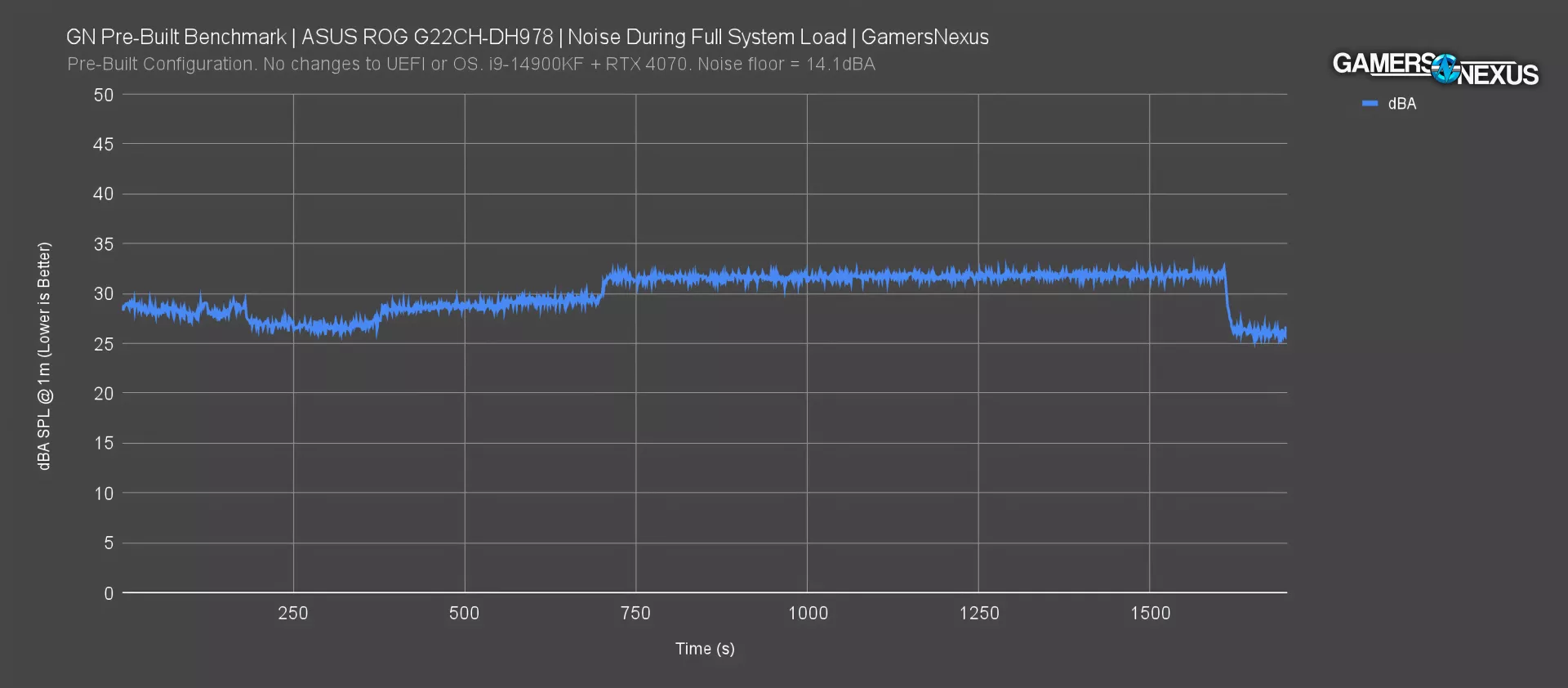 The system operated in somewhat of a stairstep pattern for its fan control: You can see these relatively quick changes at roughly 375 and 700 seconds into the test. Noise levels settled in around 31.9dBA at steady-state thermals.