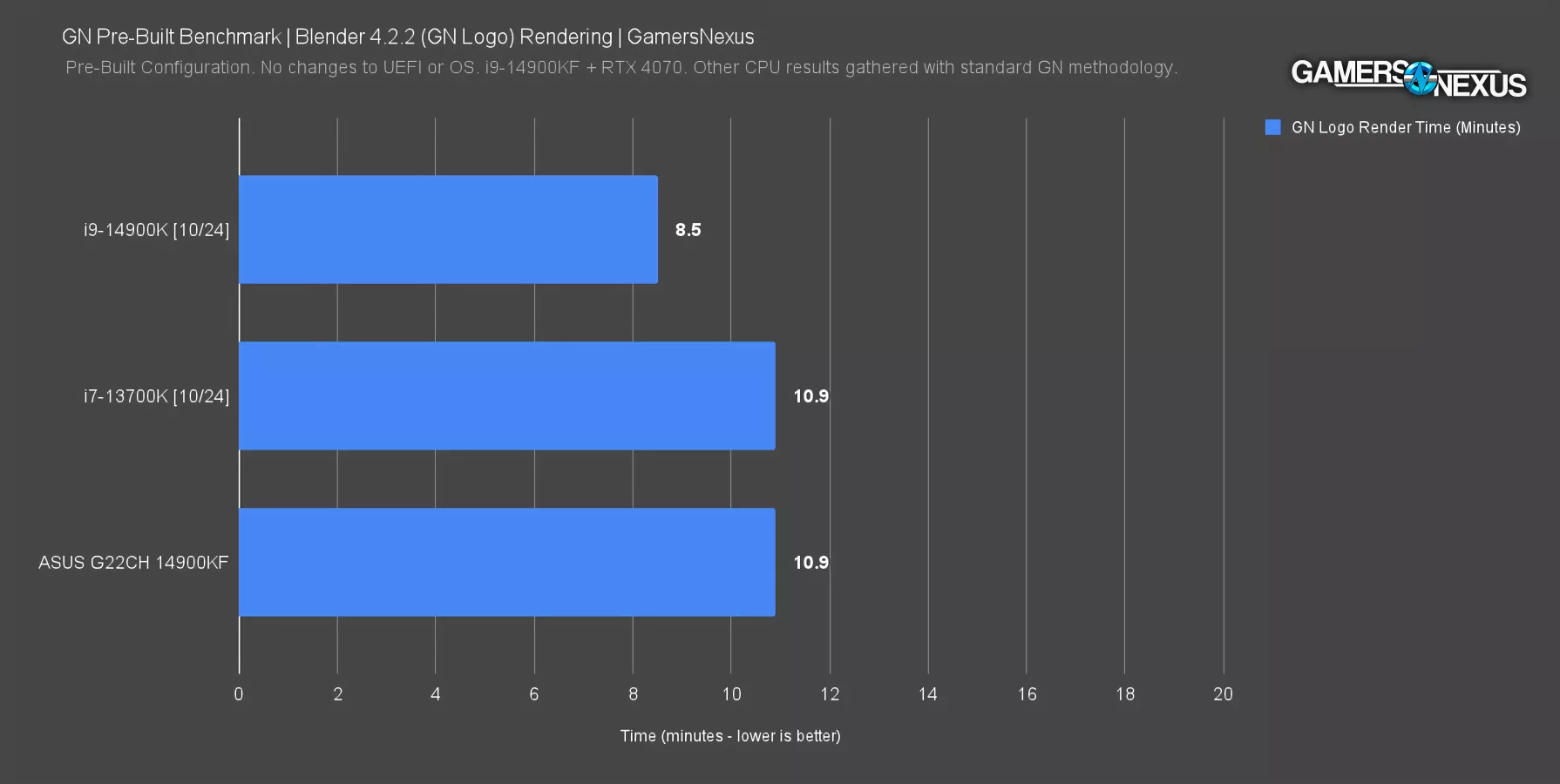 The properly configured 14900K completed the task in 8.5 minutes, while ASUS’ configuration of the same CPU required 10.9 minutes. The stock result reduces the time requirement to complete the render by 22%. ASUS set this up so poorly that it made the 14900K perform the same as a 13700K in real-world rendering performance. The 13700K (watch our review) can occasionally be found for $295 and is performing equivalently to the $484 14900K that ASUS sells you.