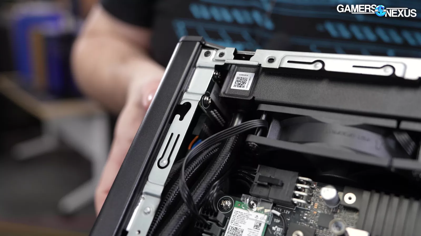 Removing the other side panel reveals the proprietary motherboard along with SO-DIMM RAM coupled with a socketable CPU. We can also see small heat sinks on the NVMe drive, VRM, and chipset.
