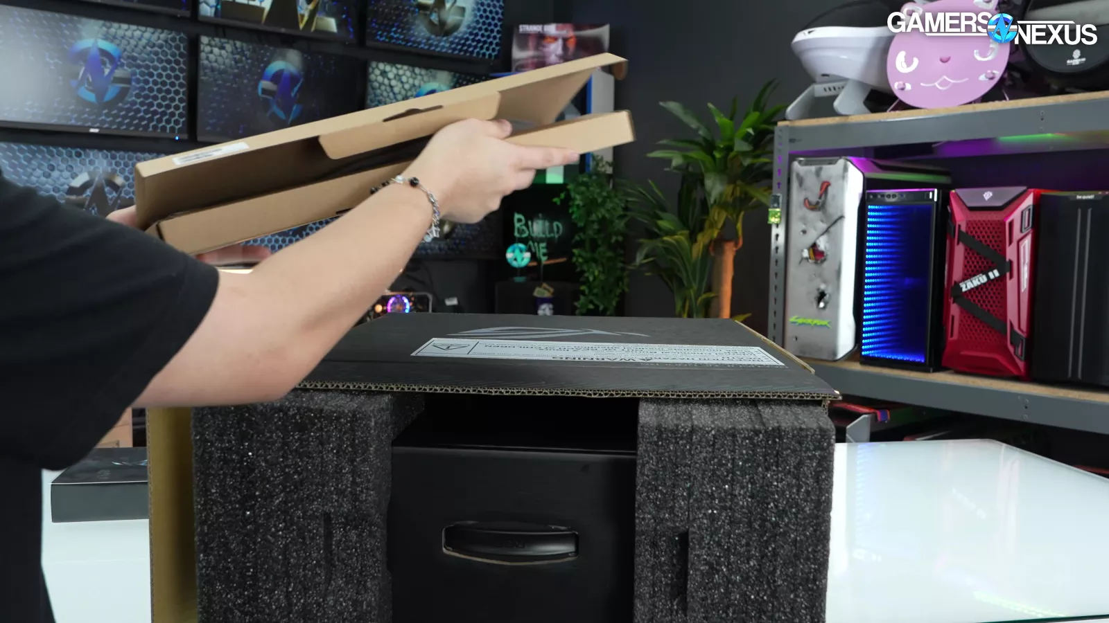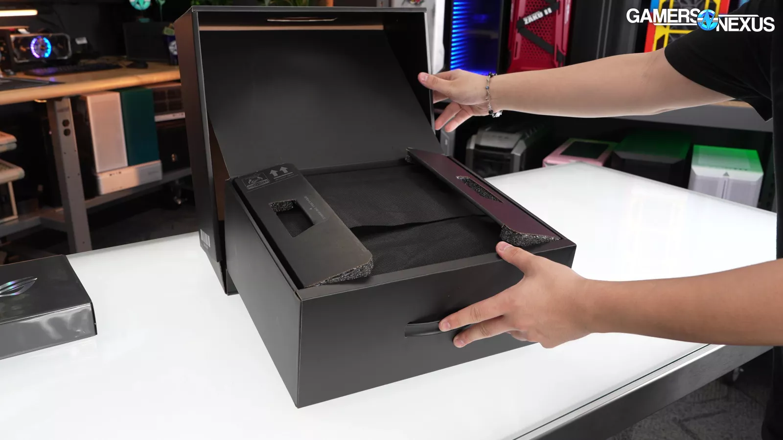 Despite being purchased in-store at Micro Center and therefore not requiring sturdy packaging, it probably could have been shipped as-is without issues. The outer box contains the accessories and four foam corners that suspend an inner box with a handle, which levers open and raises up like a pedestal. There’s a cardboard and foam sled that holds the PC itself inside a fabric bag.
