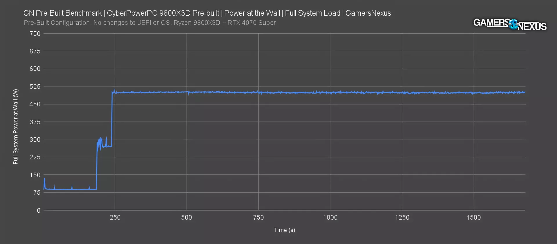 Logging power at the wall shows a very flat steady-state with an average of 500W during our torture load of Blender on the CPU and 3DMark Port Royal on the GPU. This level of load is uncommon in gaming scenarios, as it heavily loads both core components at once. This puts the 1000W PSU at 50% capacity, leaving plenty of headroom and keeping the PSU in a good spot on its efficiency curve.