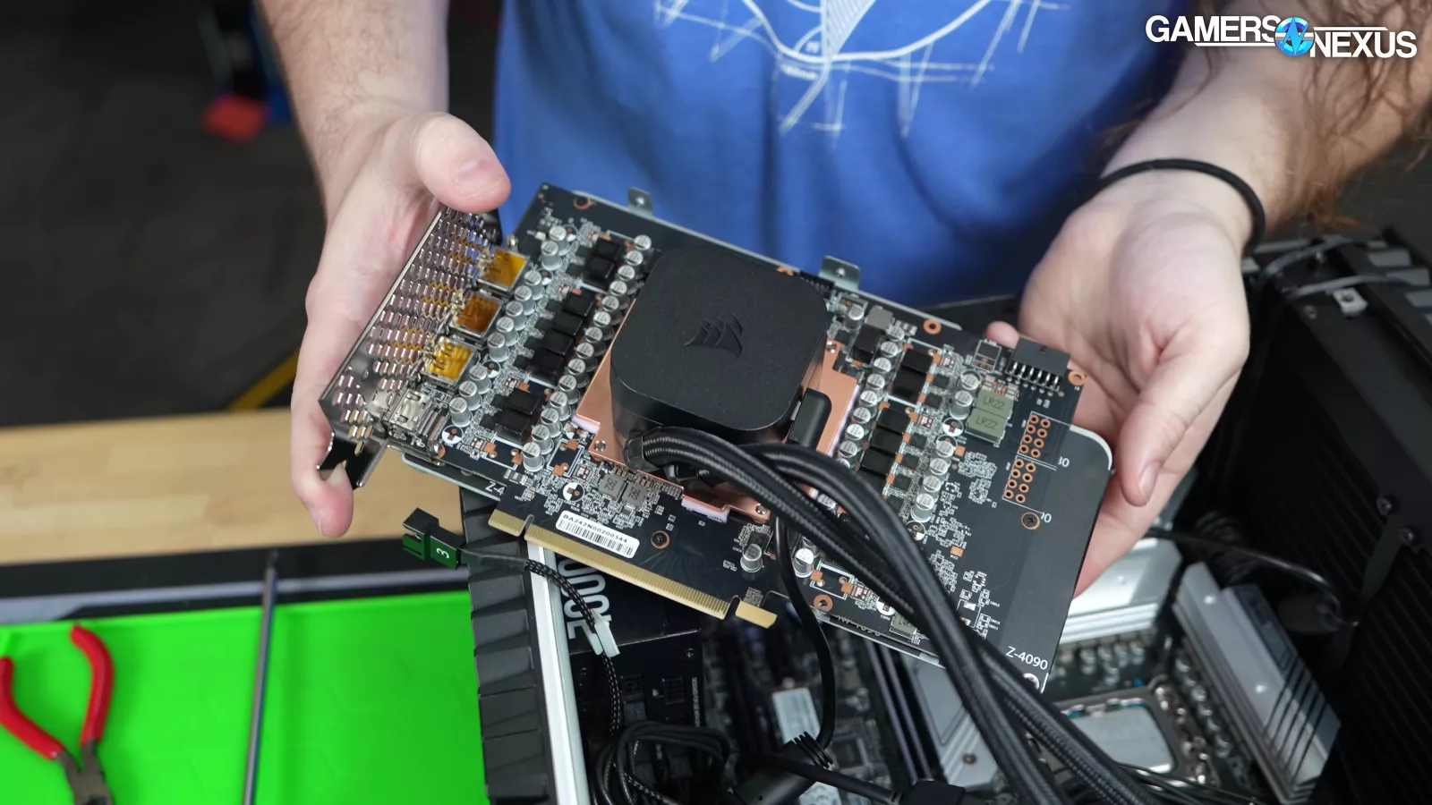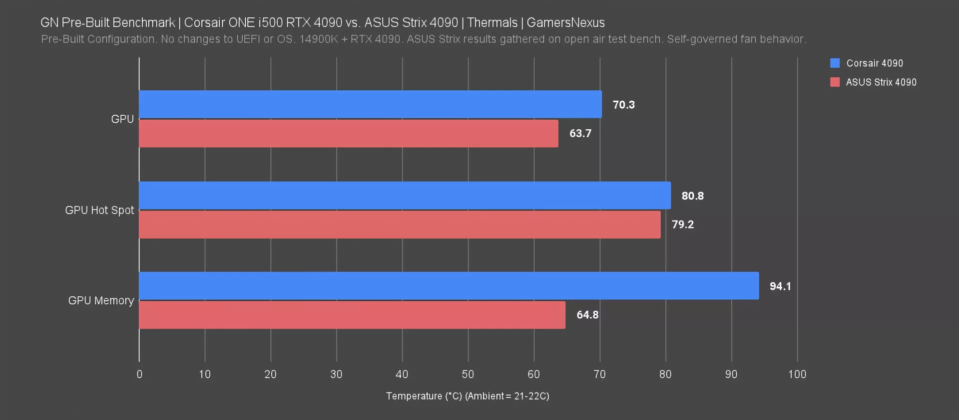 We added the ASUS Strix 4090 here just for a high-end air cooler reference and used its stock fan curve. Testing is on an open bench -- it’s not a perfectly controlled comparison, and it’s not supposed to be. The point is a reference.
