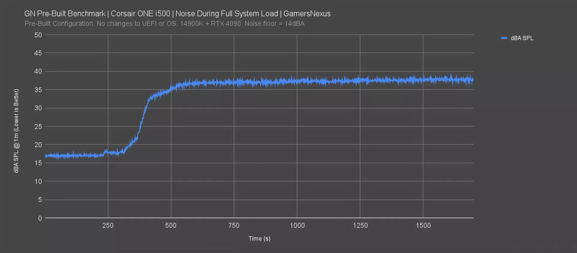 The system is very quiet at idle and during initial periods of load, hovering around 17dBA before briefly rising to about 18dBA at our noise floor of around 14. Then the noise rapidly ramps up during a period of about 100 seconds, reaching about 33dBA, then steadily increasing to settle in at an average of 37.7dBA.