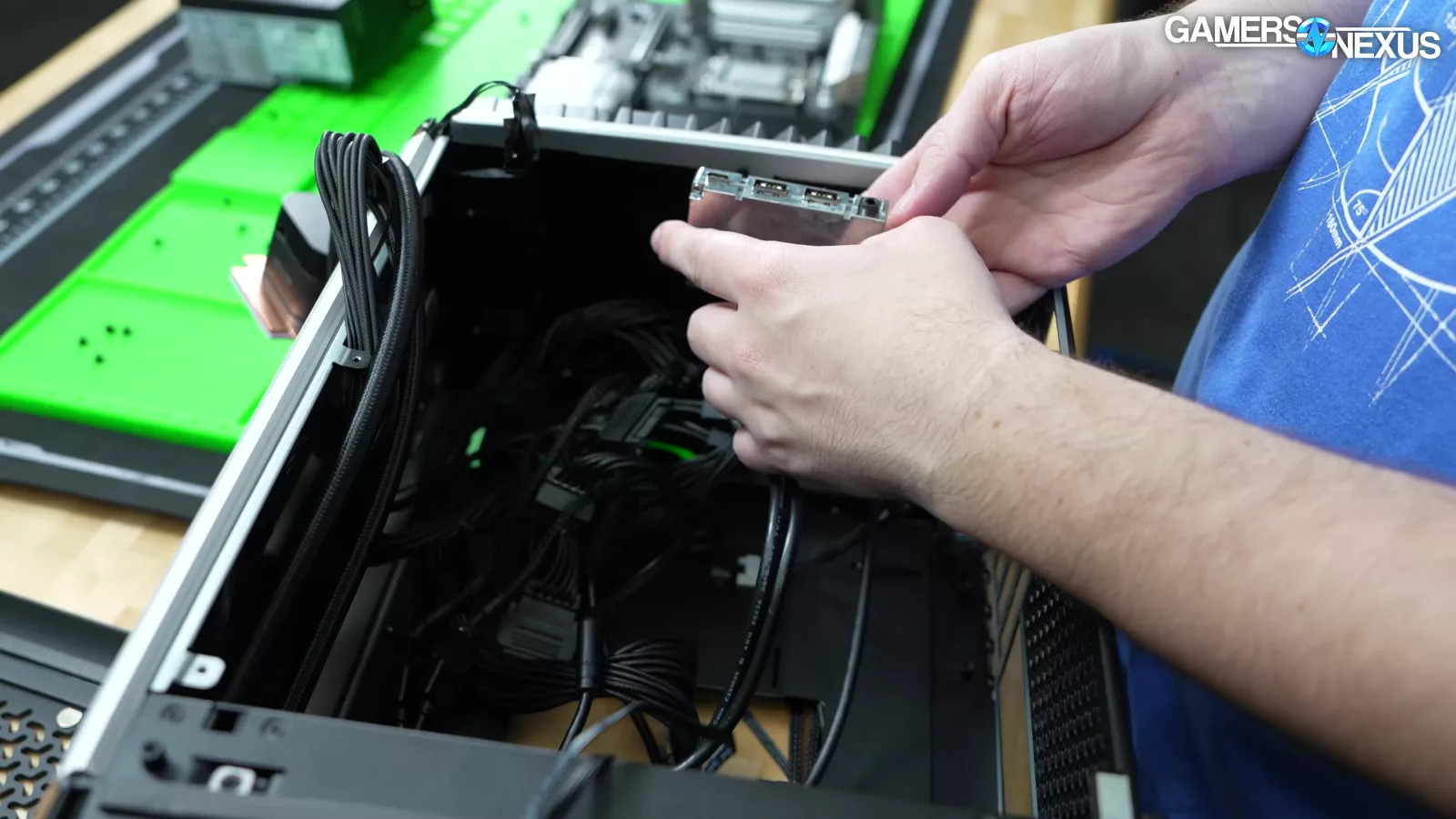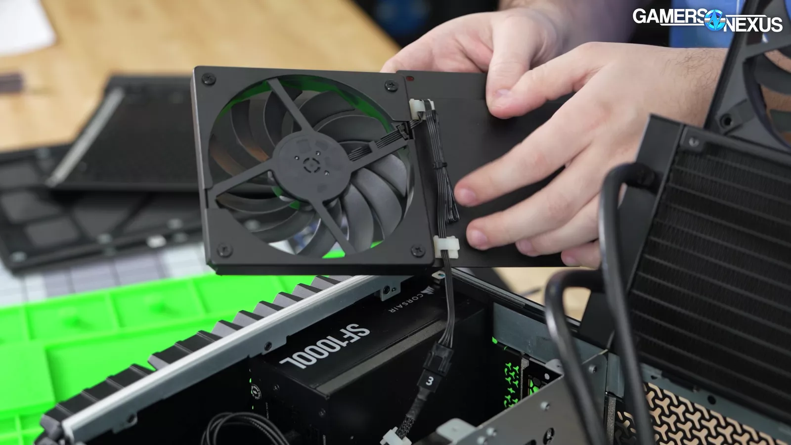 Opening the bottom fan hinge, this air will mostly hit the exposed GPU components. Because the upper half of the chassis is sectioned-off by the card and because there’s a solid steel plate next to it, most of the air finds its way out through the rear PCIe slot covers. There’s a ton of heat in this area from the PCB and GPU and no active way to get rid of it, plus the card is dividing the case, so a lot of the heat will get trapped and pool around the video card. We think this contributes to a lot of the problems.