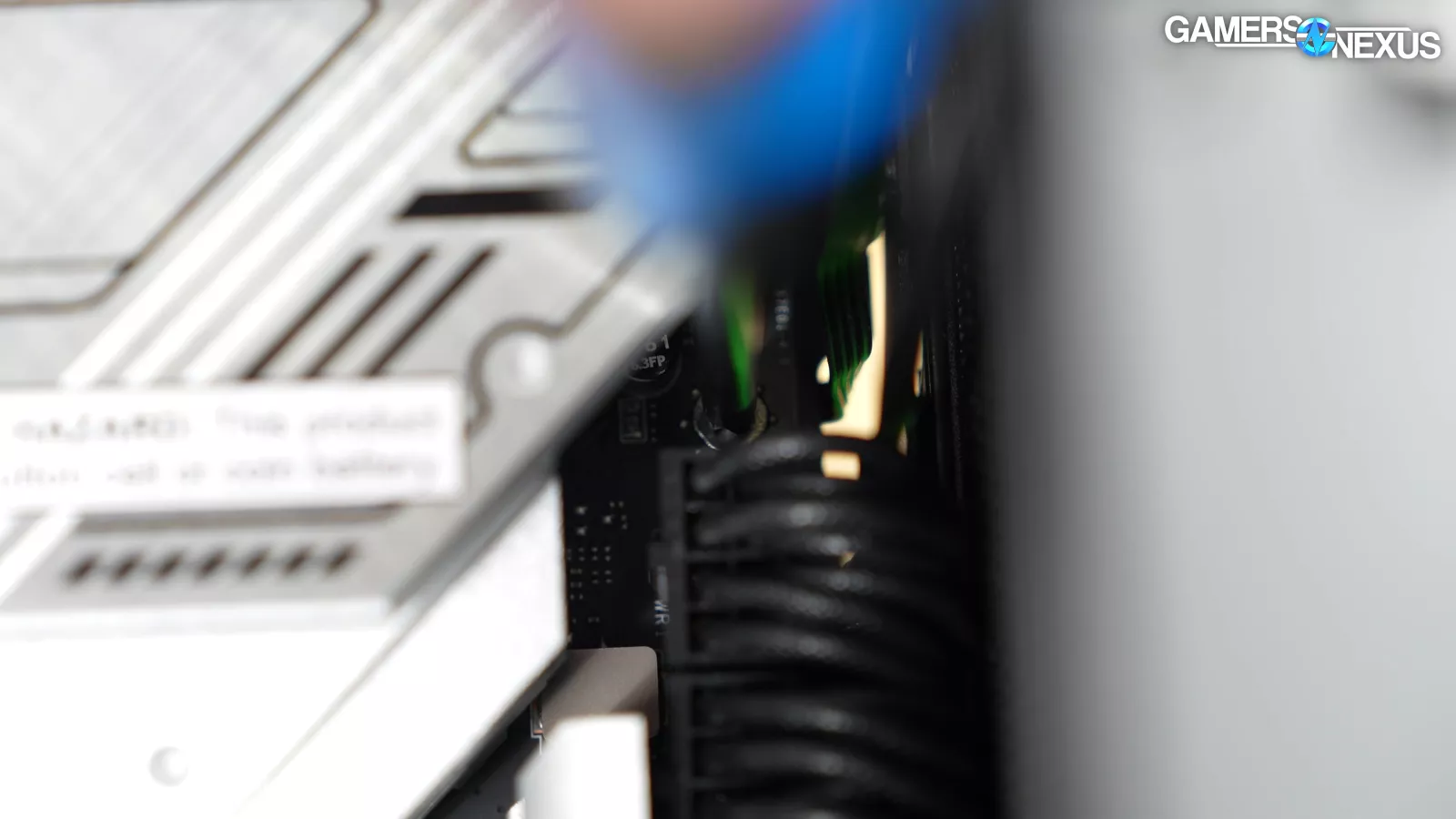 We looked at the space between the PCB and the copper cold plate to check for thermal pads and saw that a corner of the memory module had zero contact to a thermal pad. We also saw poor contact around the edges of other memory modules. This helps explain some of the poor performance we saw in our thermal results.