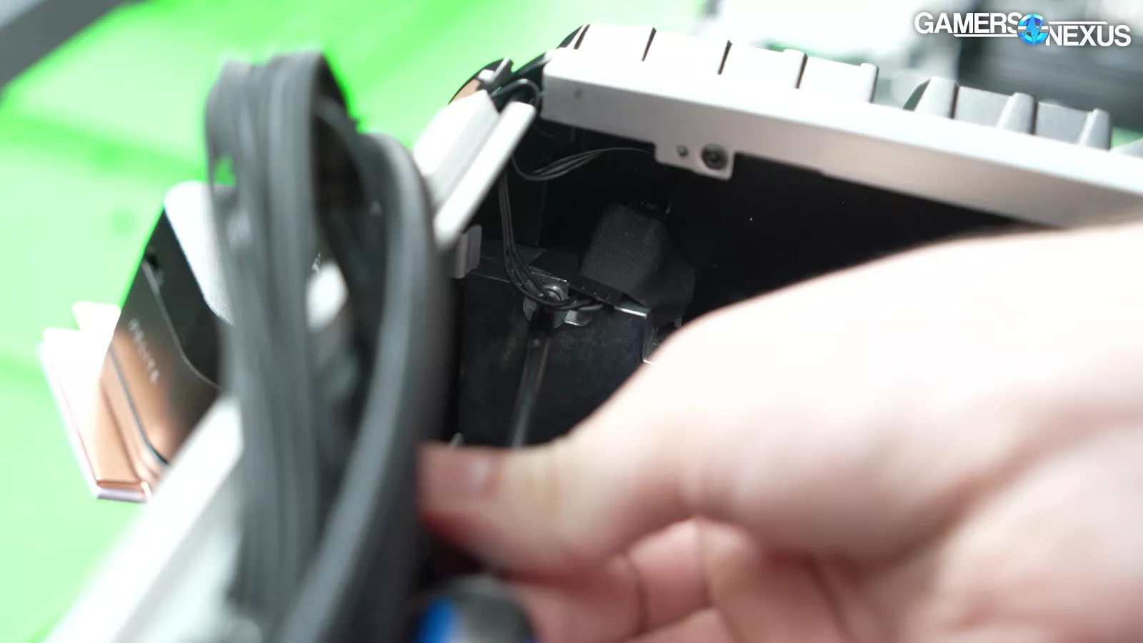 Inside the case, we can see multiple clips that manage one of the fan cables. It’s a nice touch, but they are held down by adhesive, which come off easily as a result of the extreme heat build-up within the system. Corsair fully customized this case specifically for this purpose, so choosing not to build metal cable tie points into the case is not only bizarre, but a waste of an opportunity. The point of going fully custom is to not need to resort to glue.