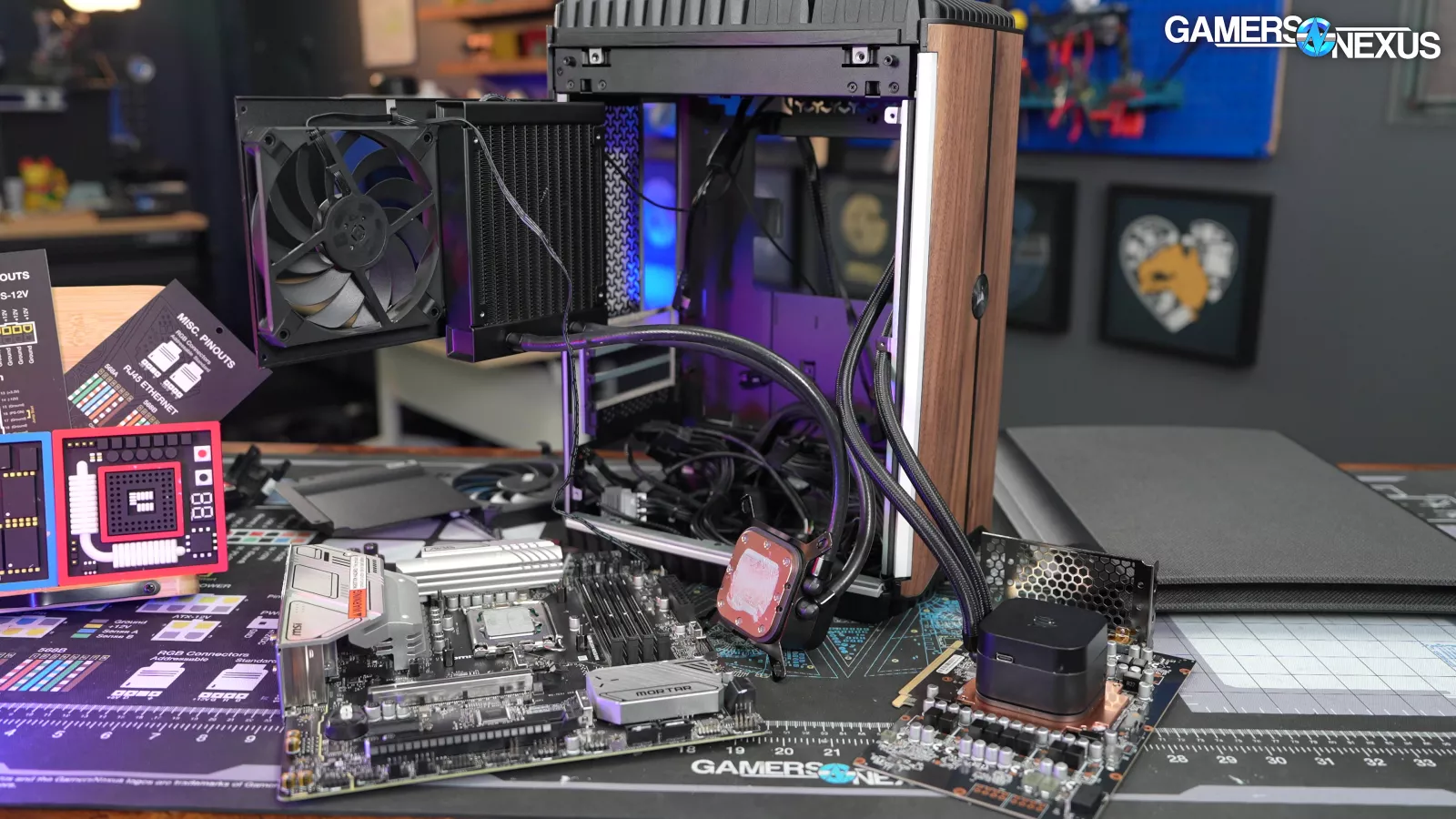3 fans are revealed from removing the left panel. Some of these are on a hinging mechanism that we actually liked, if not for all the other problems. It’s a good way to get side intake without the panel itself being tethered to a cable. Opening the hinged door reveals the top exhaust fans mounted to the GPU radiator, with one fan attached to CPU liquid temperature.