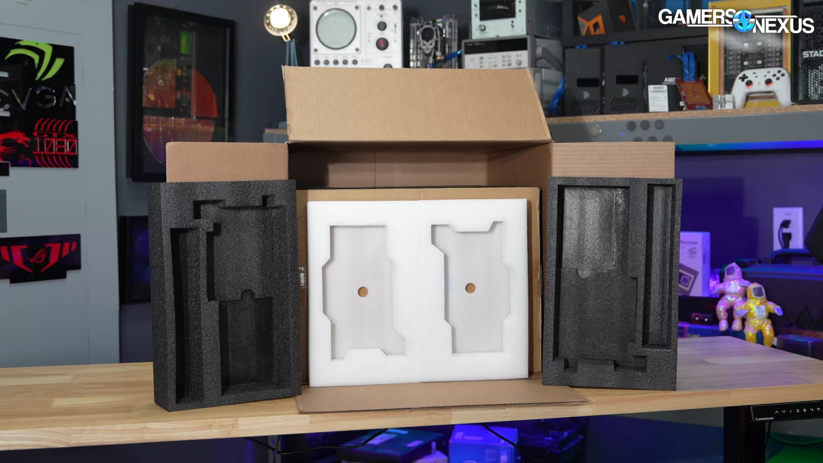 Thermaltake’s packaging was generally pretty good, utilizing the tried and true box-in-a-box method, but with the oddity of using GPU box foam inserts as packing material (and from a different GPU than the one in our system, no less). We have no way to know if this is routine practice or if the warehouse just ran out of the usual stuff – at least it’s recycling. The PC itself was packed inside the case box as usual.