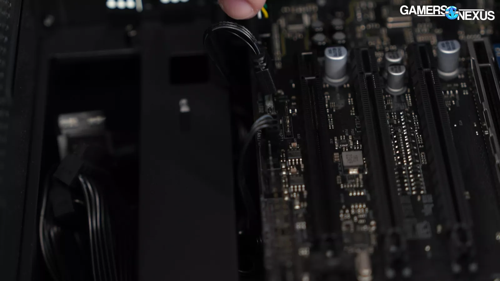 The bag of accessories inside the case has the case manual, SATA cables, WiFi antennae, extra screws, and, curiously, two 12VHPWR adapters. One of them is the official NVIDIA adapter that probably came with the 4070 Super and the other is a mismatched-white that just looks bad. Nothing in the build is white themed, so we assume this was an accidental inclusion. Including the native NVIDIA adapter is good though, as there are a lot of reasons a user may want it in the future. Keeping the card’s accessories with the card is the right move and we’re happy to see it. Some SIs just toss the extras, which could minimally pose issues for second-hand resale when done with the system.