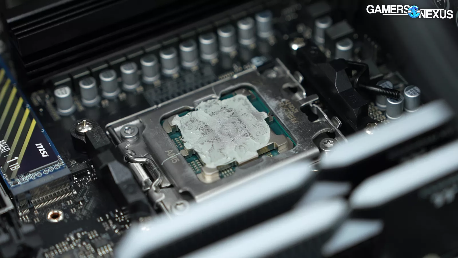 With the CPU cooler removed, the paste on the processor looks okay. There was one corner which could have used a little more thermal paste. We can also see there was a lot of force applied to it. Thermally, it was fine in our testing.